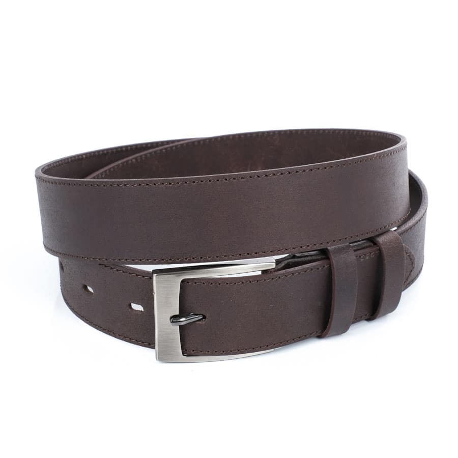 Valódi bőrből készült férfi öv sötétbarna színben, hagyományos ezüst színű fém övcsattal.