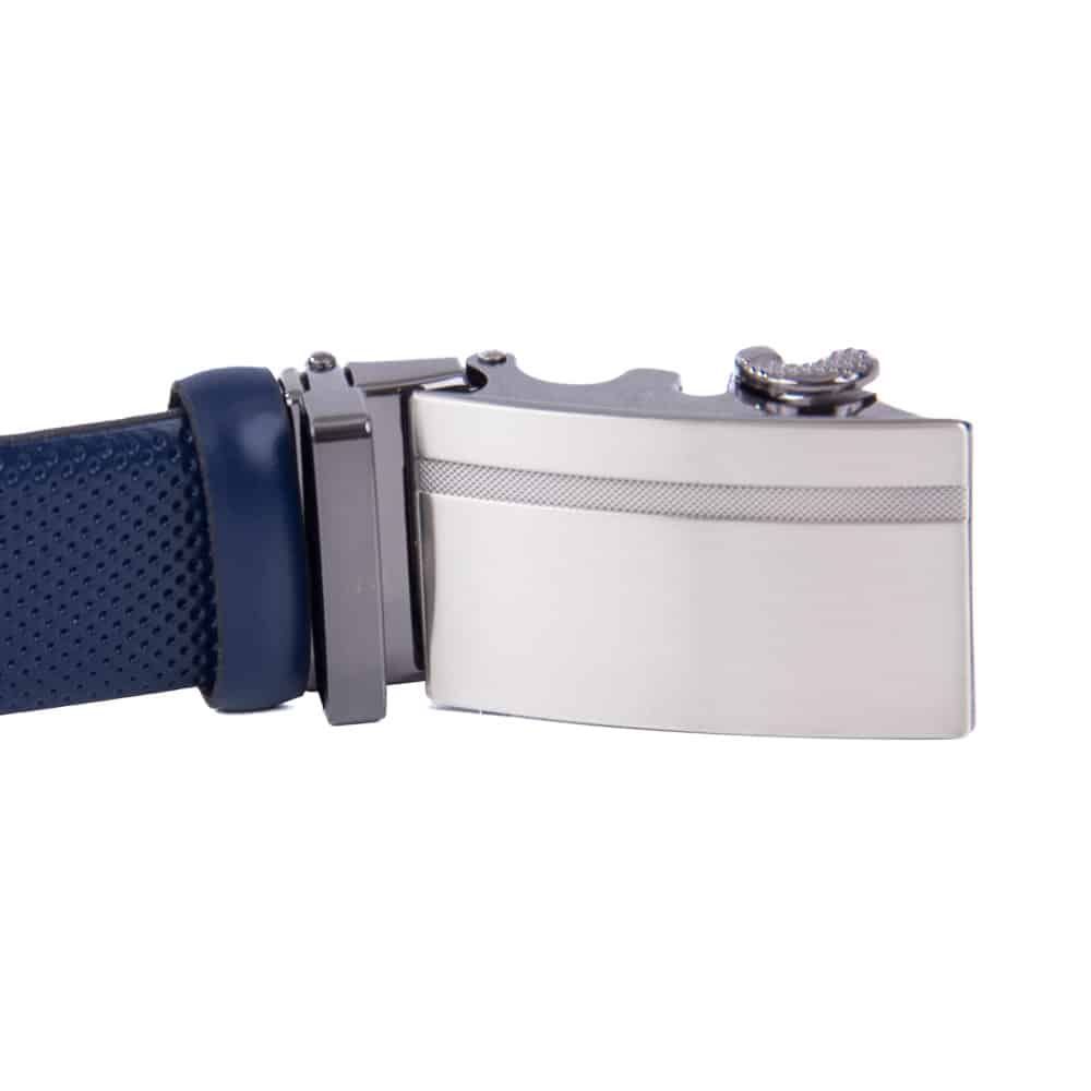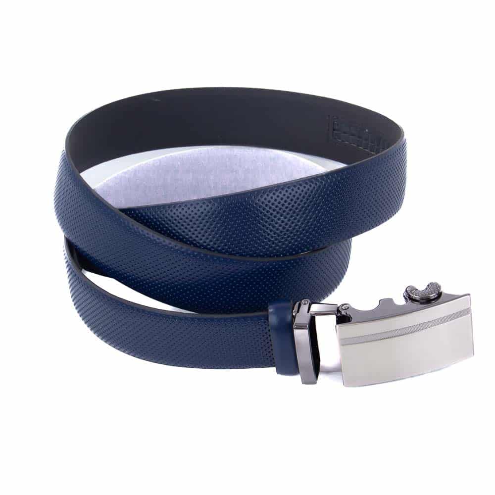 Valódi bőrből készült férfi öv kék színben szemcsés mintával, antracit szürke automata övcsattal.