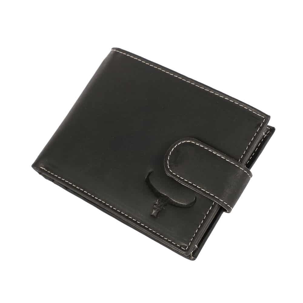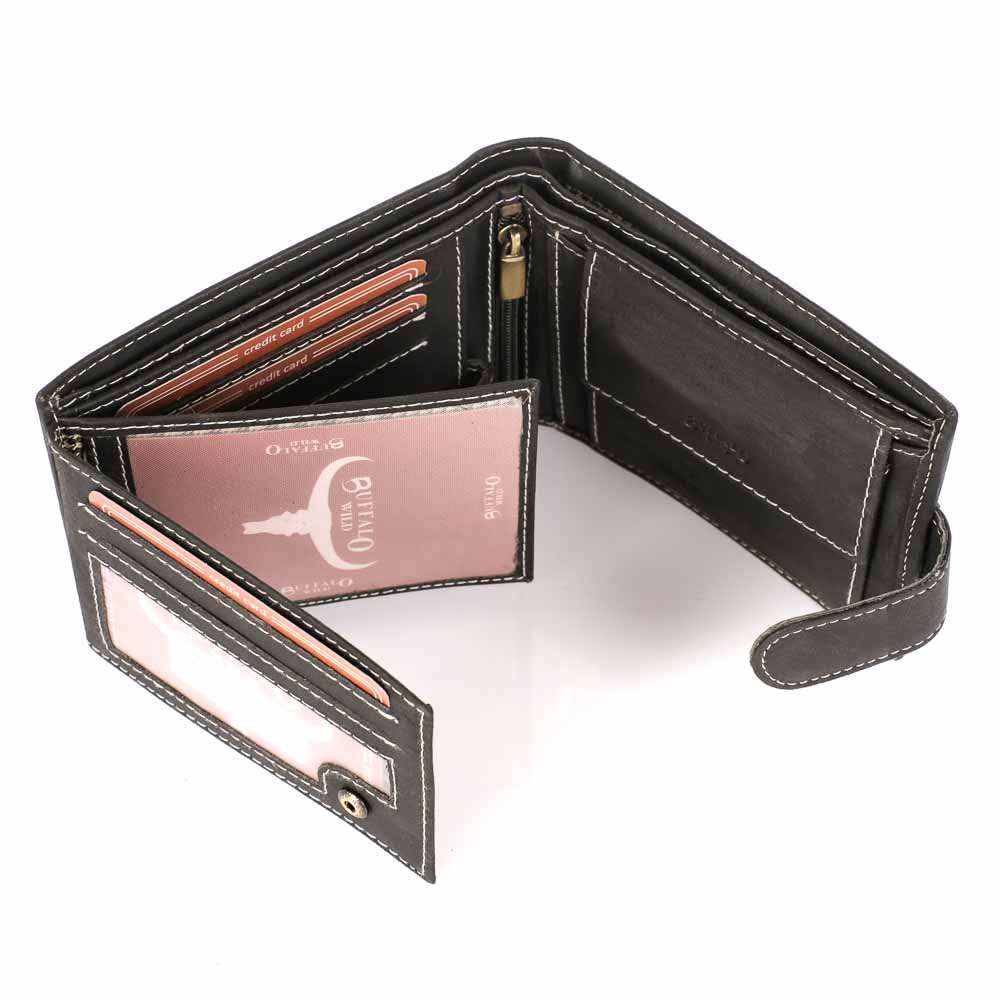Elegáns, enyhén koptatott fekete borítással készült magas minőségű valódi bőr férfi pénztárca, fekvő kivitelben, Buffalo logóval az elején, világos cérna varrással.