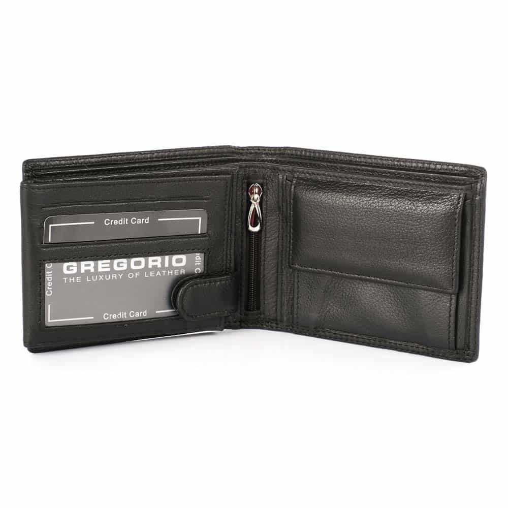 Finom tapintású valódi bőrből készült Gregorio férfi pénztárca. Fekete színben, matt borítással. Két papírtartó résszel, hagyományos patenttal zárható aprópénztartó résszel. 16 darab irat és kártya tárolására alkalmas kialakítással. Belső felületén cipzárral zárható zsebrésszel. Mérete 12,5*10 cm, így farzsebben is kényelmesen hordható.