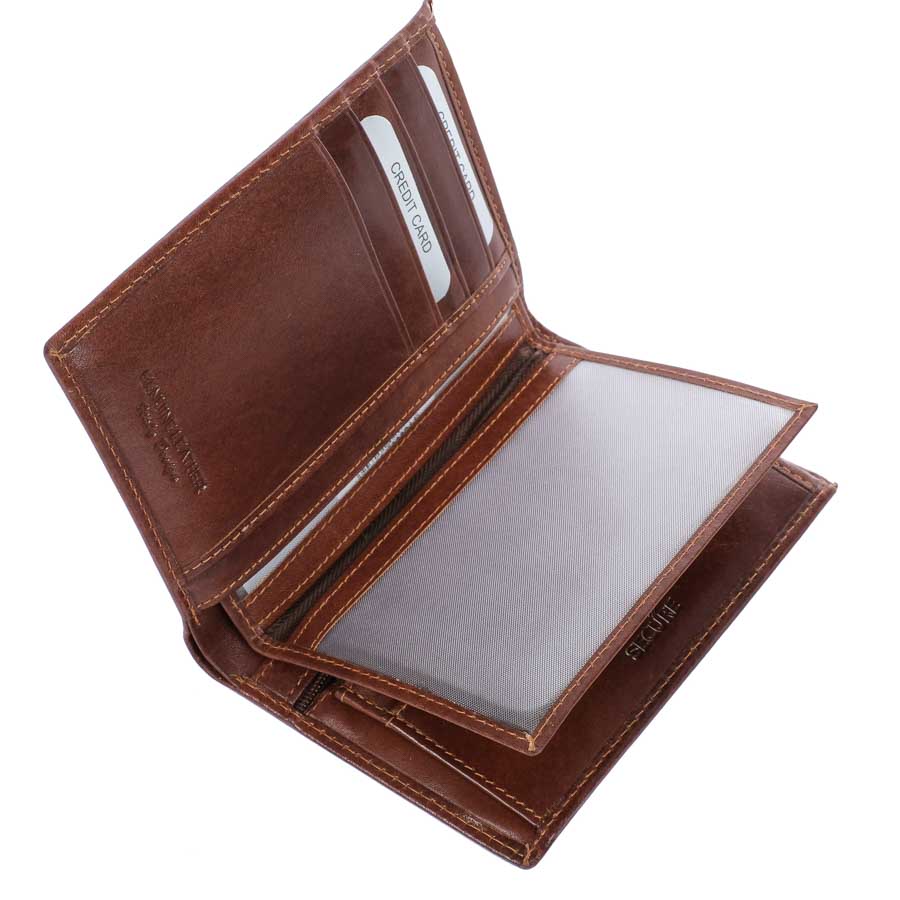 Elegáns, selyemfényű barna borítással készült magas minőségű valódi bőr férfi pénztárca, álló kivitelben, kivehető irattartóval, Rovicky logóval az elején
