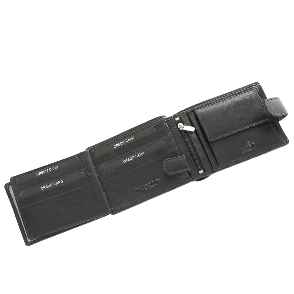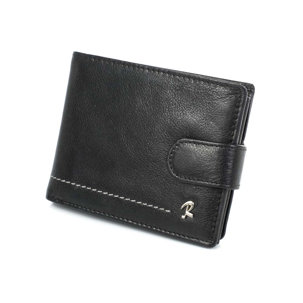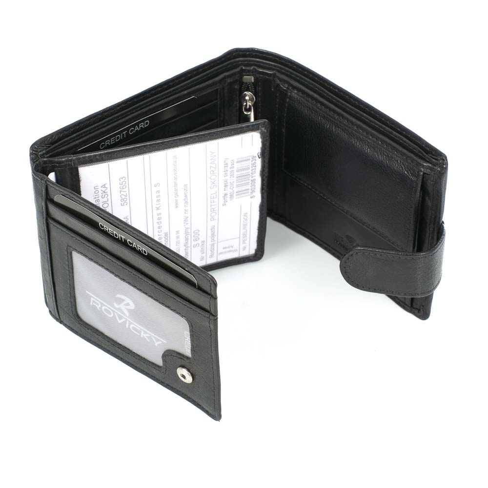 Elegáns, selyemfényű fekete borítással készült magas minőségű valódi bőr férfi pénztárca, fekvő kivitelben, Rovicky logóval az elején