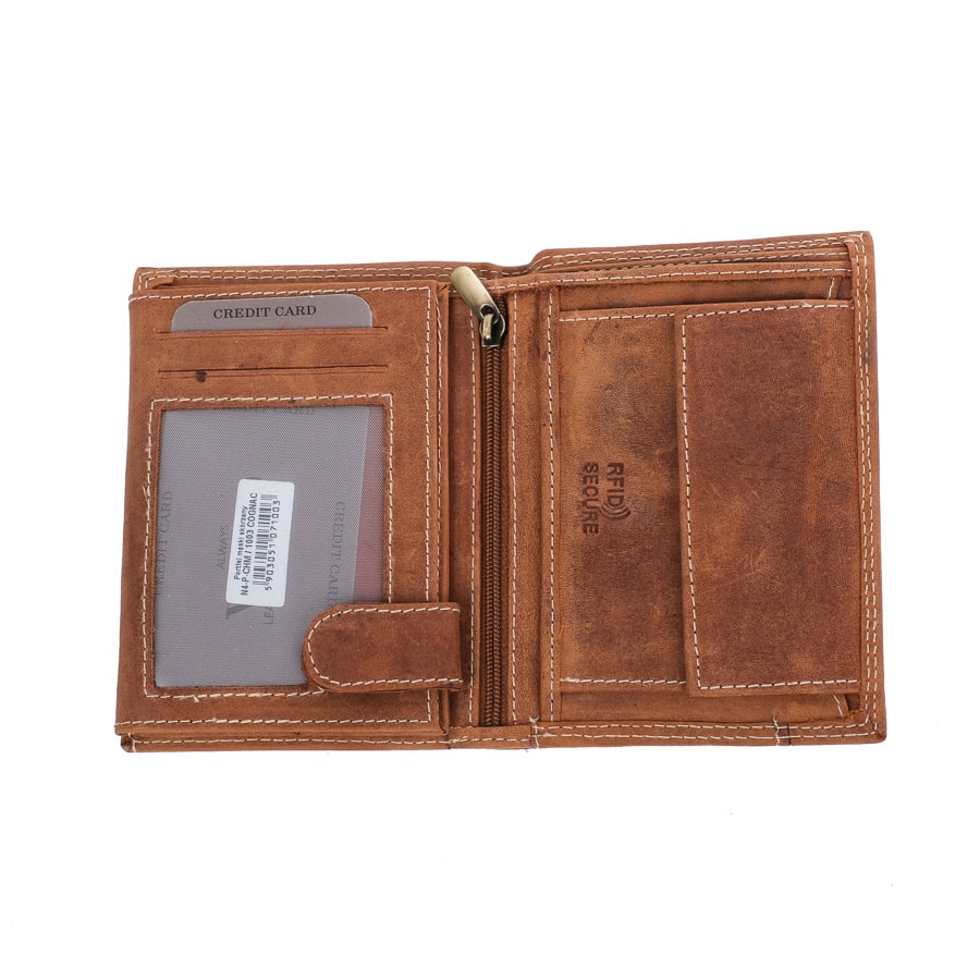 Konyakszínű borítással készült valódi bőr férfi pénztárca, világos cérna varrással, elején WILD logóval. Elegáns, letisztult designnal és praktikus álló kialakítással. Patenttal zárható aprópénztartóval, két papírpénztartó résszel, és 15 db kártya vagy irat tárolására kialakított hellyel. 13,5 x 10 cm –es méretű kialakításának köszönhetően farzsebben is kényelmesen elfér. A tárca hátoldalon is találhatunk egy kártyatartó zsebet.