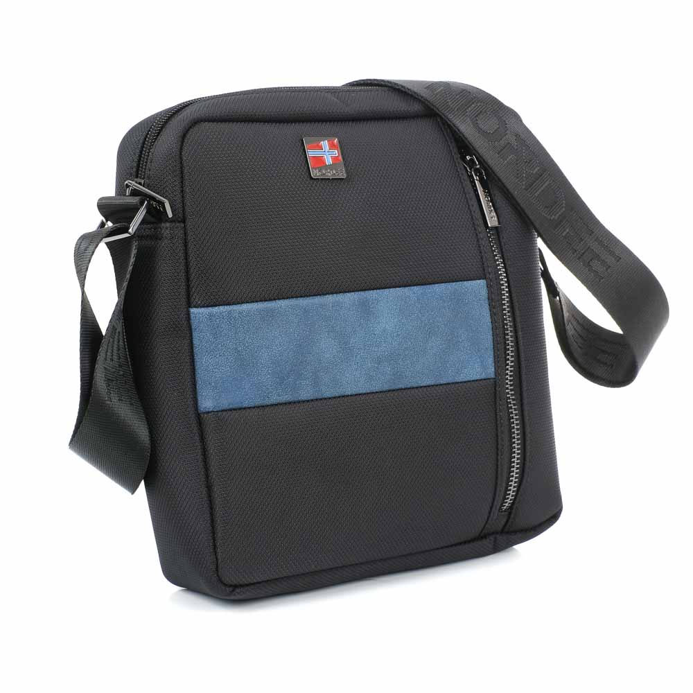 Praktikus és fiatalos férfi válltáska, fekete színben, elején kék betéttel. Ebben a táskában minden személyes holmi kényelmesen elfér, mérete: 20 cm x 23 cm. A táska cipzárral nyitható belső részében egyik oldalt egy belső cipzáros zsebet, a másik oldalt dupla telefontartó zsebet találunk. A táska elején is találunk egy cipzáros zsebet, illetve a hátulján is található egy zseb.