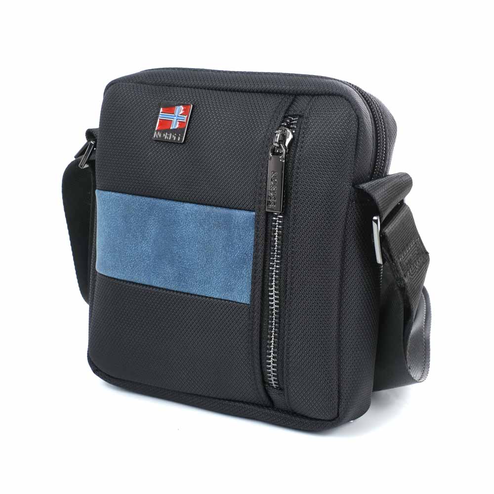 Praktikus és fiatalos férfi válltáska, fekete színben, elején kék betéttel. A kis méretű táskát keresőknek ajánljuk, külső mérete: 15 cm x 18 cm. A táska cipzárral nyitható belső részében egyik oldalt egy belső cipzáros zsebet, a másik oldalt dupla telefontartó zsebet találunk. A táska elején is találunk egy cipzáros zsebet, ahová elsősorban az iratainkat tehetjük.