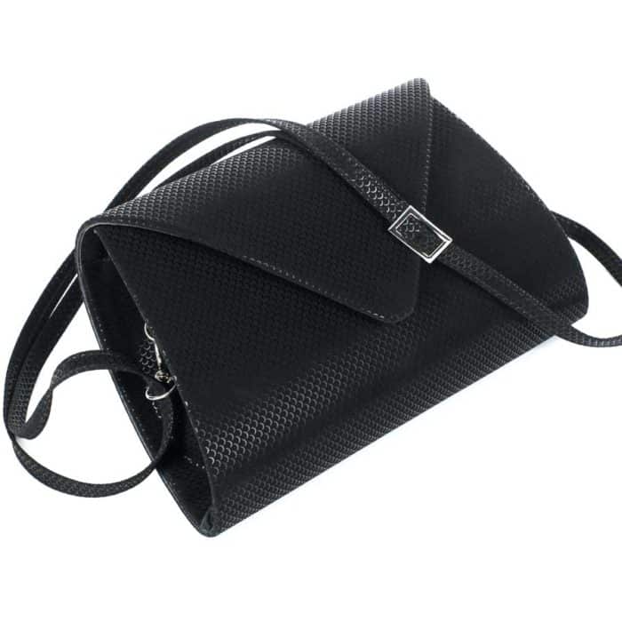 Egyszerű, letisztult vonalvezetéssel szinte bármilyen stílusú alkalmi ruhához megfelelően passzol. A lecsatolható vállpánt állítható hosszúságú, vállpánt nélkül szolid, de rendkívül szemrevaló borítéktáskaként is hordható. A táska belseje egy részből áll, oldalt cipzáras zseb található. A táska mágneses patent segítségével nyitható és zárható, mely követi a divat trendeket. A táska mérete: 24 cm széles (alul), 16 cm magas és 6 cm vastag