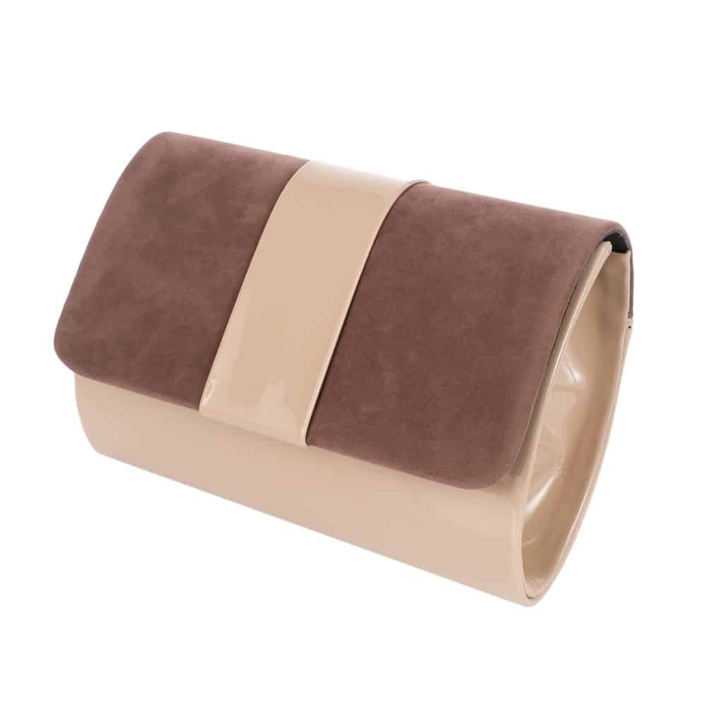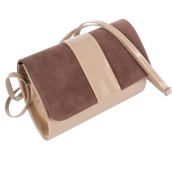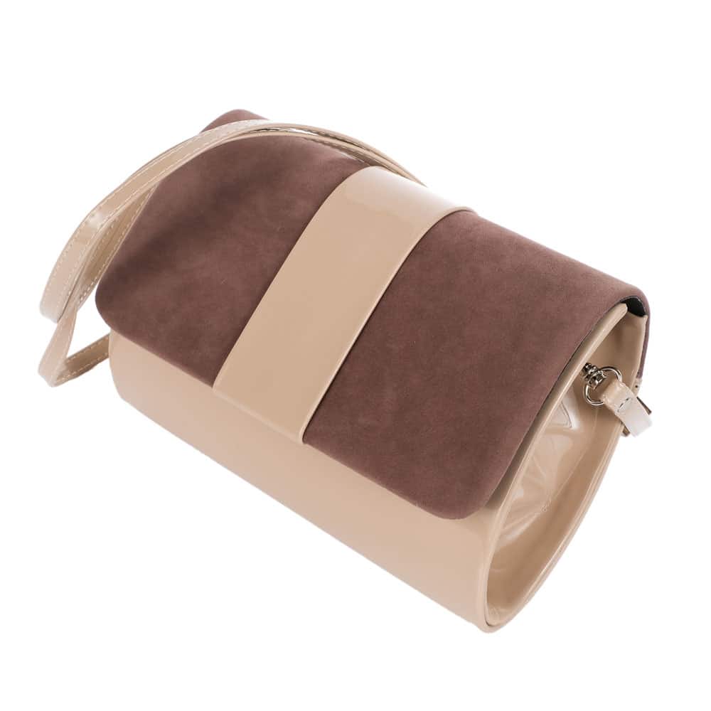 Alkalmi táska letisztult eleganciával, különleges barna és bézs színben. Lecsatolható vállpánttal, belsejében pedig praktikus zsebbel rendelkezik. Mágnesen patenttal zárható. Alsó része fényes lakkozott, felső része plüssszerű puha borítással.