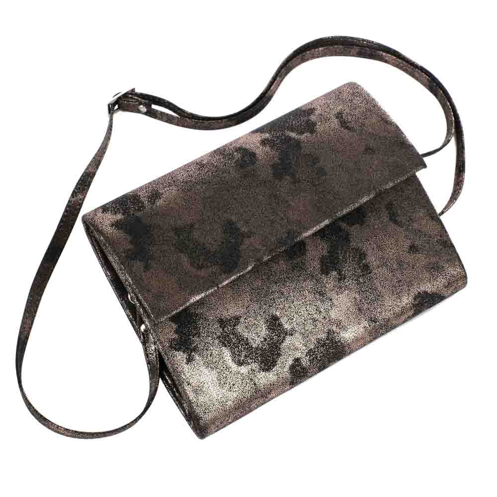 Ez a táska igazán egyedi kiegészítője lehet alkalmi viseletének! Egyedi mintázattal rendelkezik aranybarna és fekete színben.