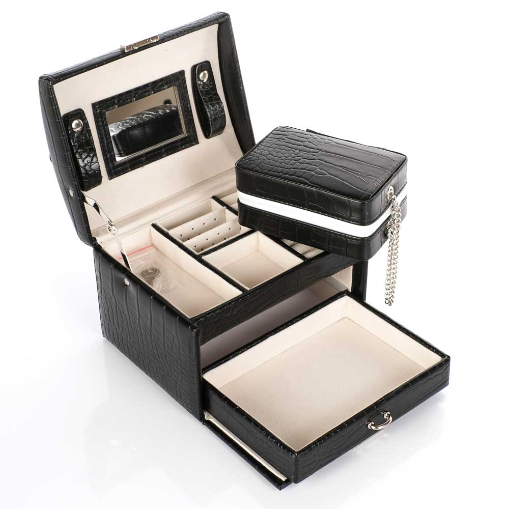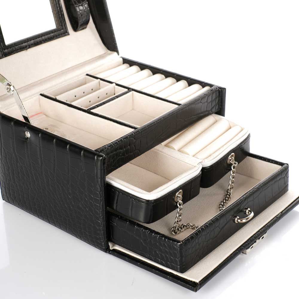 Tárolja rendezetten ékszereit a Patrizia Beauty exkluzív ékszerdobozában. A különleges fekete műbőr borítású doboz külső mérete: 17 cm x 14 cm x 13 cm. Felül hordozófül található. Ezüst színű csatja kulccsal zárható. A doboz belső része nagyon praktikus, számos rekesz és egy tükör is található benne. A lánccal kihúzható rekesz összecipzározható, és így egy kis méretű mobil tartónk lesz, amit könnyen magunkkal vihetünk a kézitáskánkban.