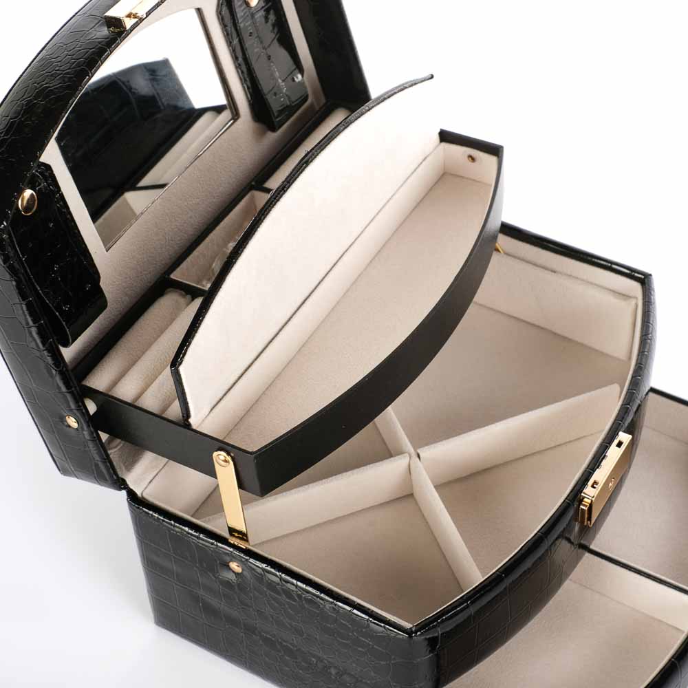 Tárolja rendezetten ékszereit a Patrizia Beauty nagy méretű és nagyon exkluzív ékszerdobozában. A különleges műbőr borítású doboz külső mérete: 22 cm x 16 cm x 13 cm. Felül hordozófül található. Arany színű csatja kulccsal zárható. A doboz egy kinyitó mechanikával lett ellátva, ami azt jelenti, hogy a doboz tetejének felemelésekor az alsó fiókrész automatikusan csúszik ki. A doboz belső része nagyon praktikus, számos rekesz és egy tükör is található benne.