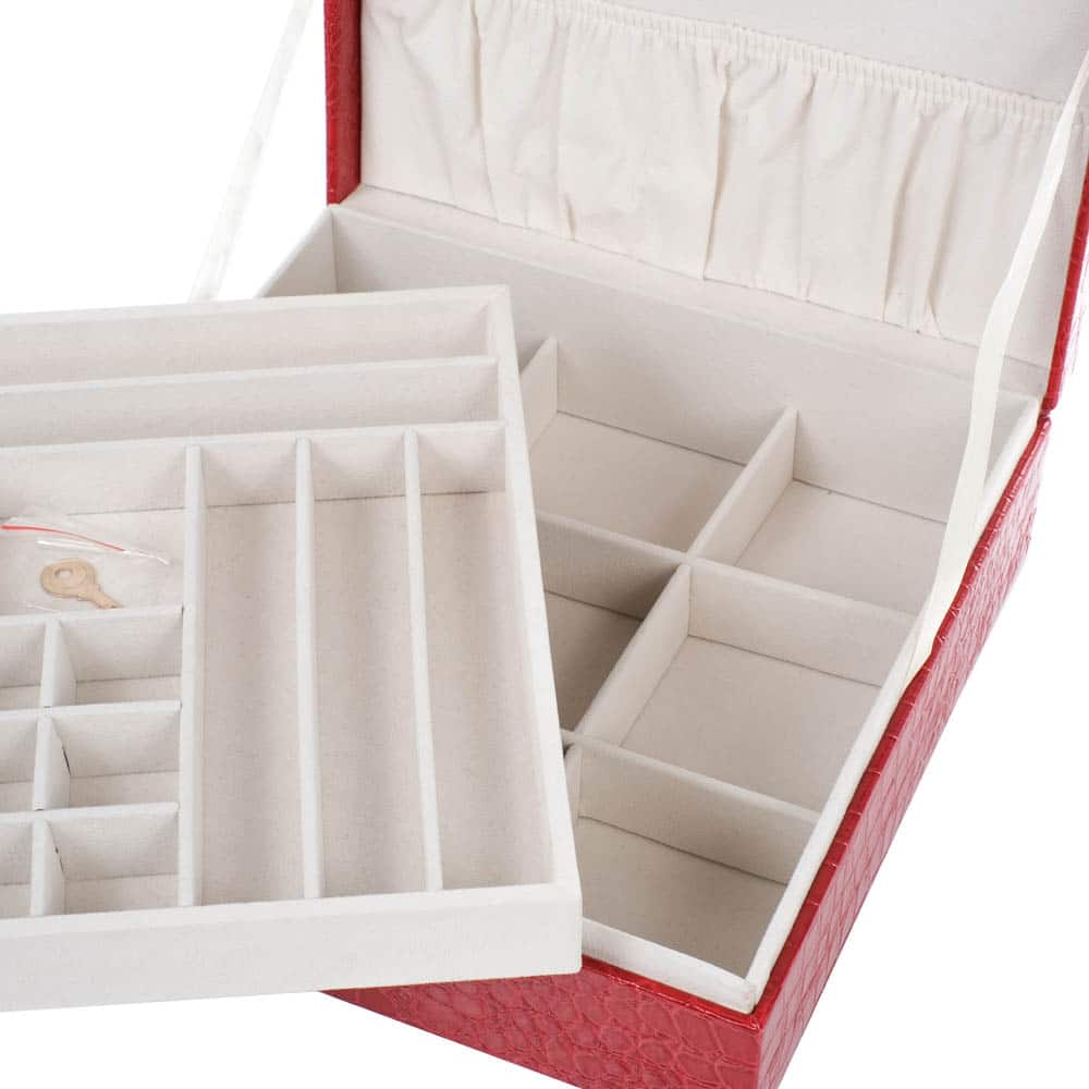 Az ékszerdoboz külső mérete 26 cm x 26 cm x 9 cm, ami elegendő helyet biztosít az értékes tárgyak számára. Az arany színű csatot kulcs segítségével zárhatod, így biztonságban tarthatod az ékszereket.