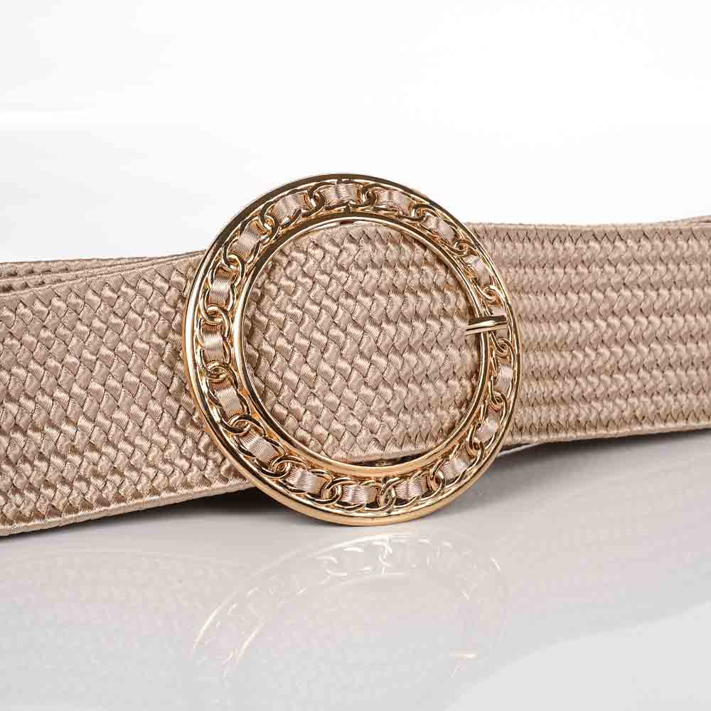 Alkalmi öv nagyobb derékbőséghez. Rugalmas, 6 cm széles fonott öv bézs színben, melyet dekoratív, aranyszínű csattal lehet a megfelelő feszességre beállítani.