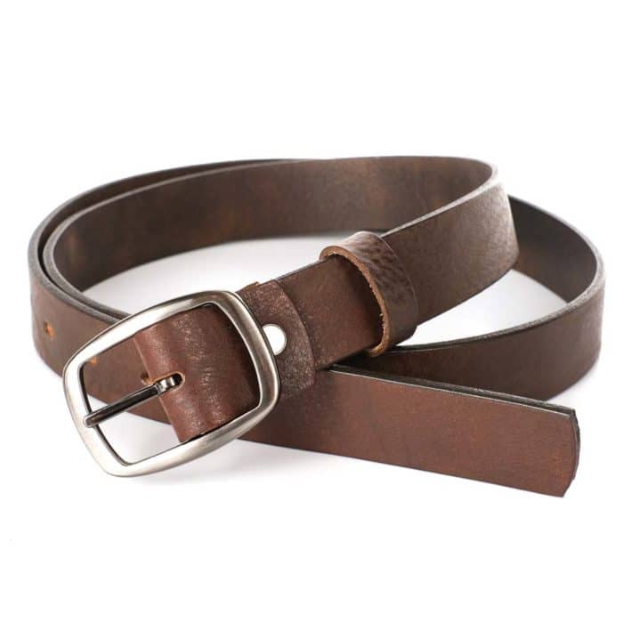 Valódi bőrből készült női öv sötétbarna színben, hagyományos fém övcsattal.