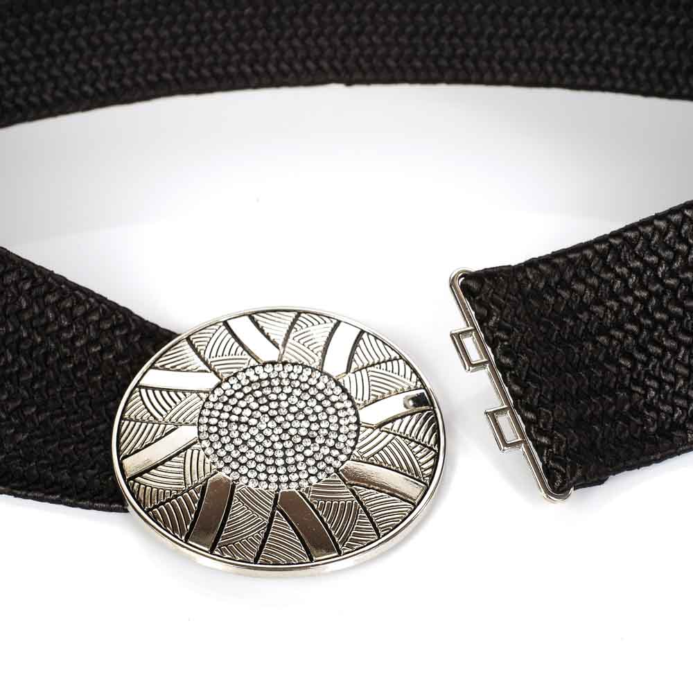 Dekoratív, 6 cm széles fekete alkalmi öv, kövekkel kirakott csattal. Rugalmas anyagból készült, 80 cm és 125 cm közötti derékbőséghez használható.
