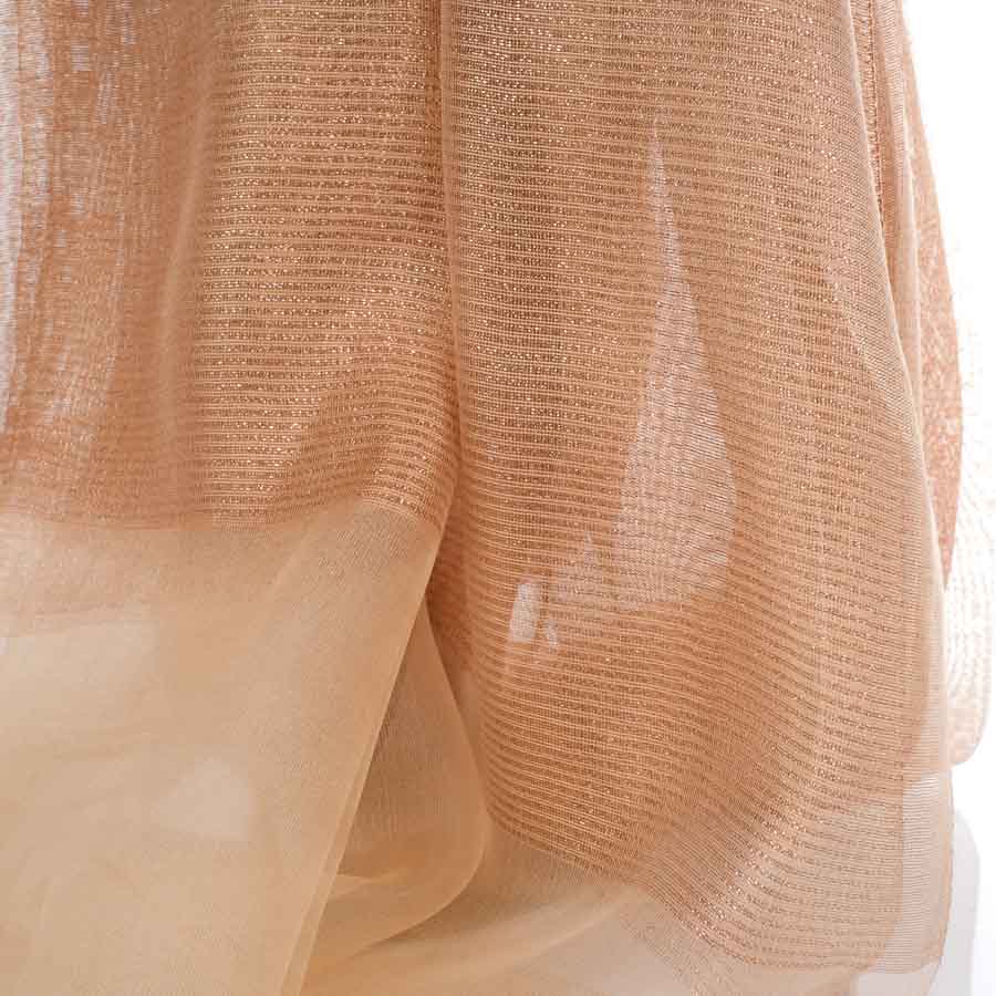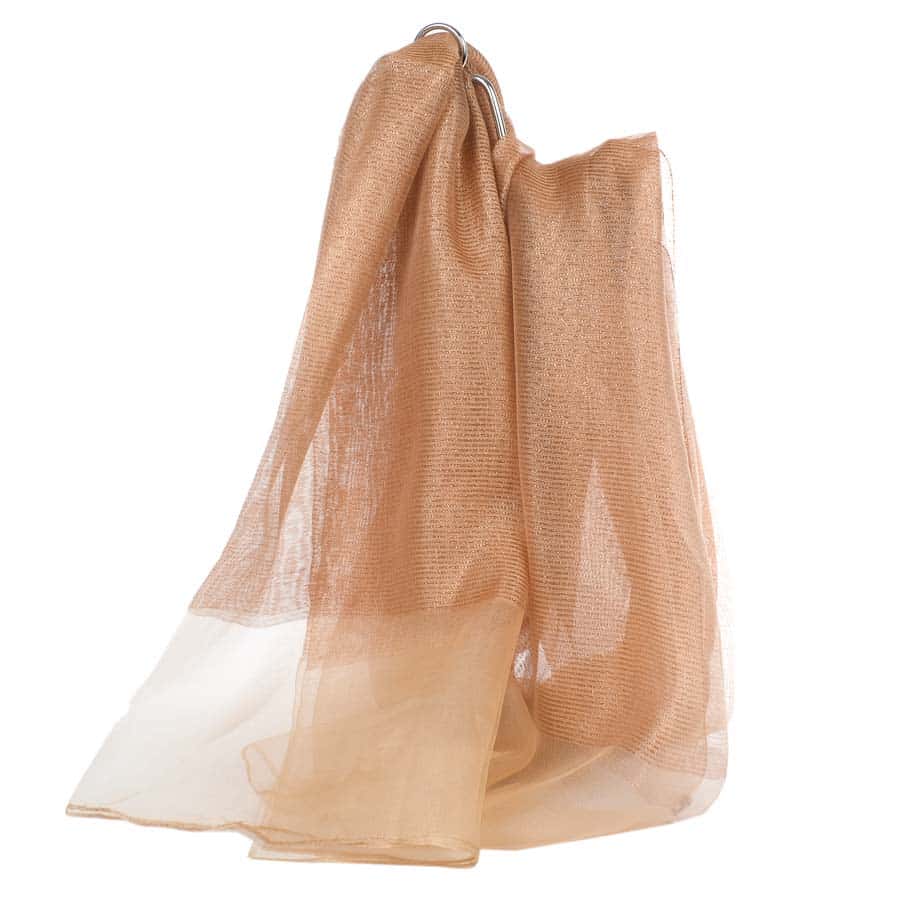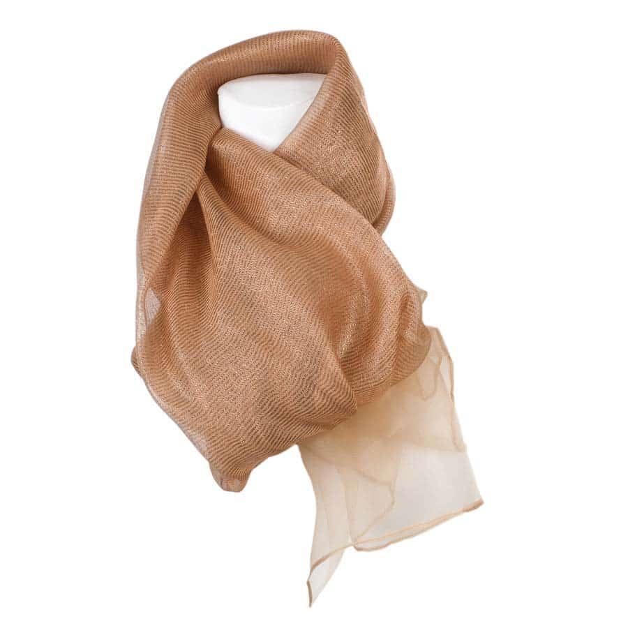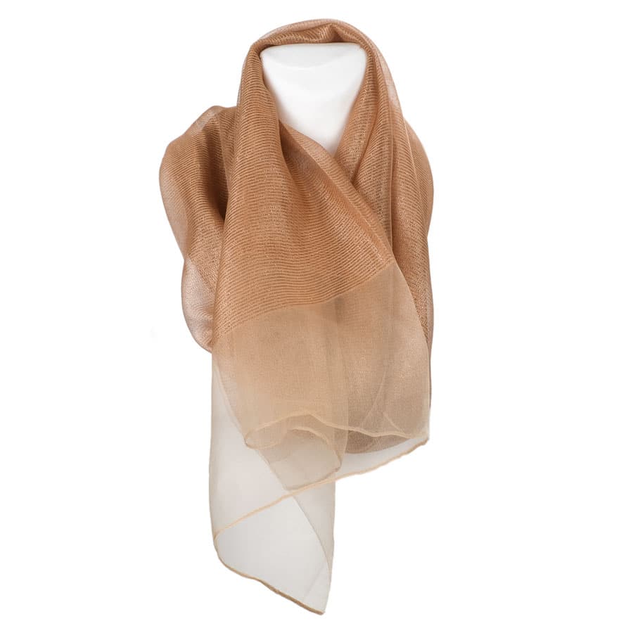 Nagy méretű vékony tavaszi kendő, alkalmi sál. 75 cm x 190 cm, így a legkülönbözőbb formákban is megköthető. Exkluzív csillogó szövés, különleges aranyszínű árnyalat jellemzi, 30% selyemtartalommal.