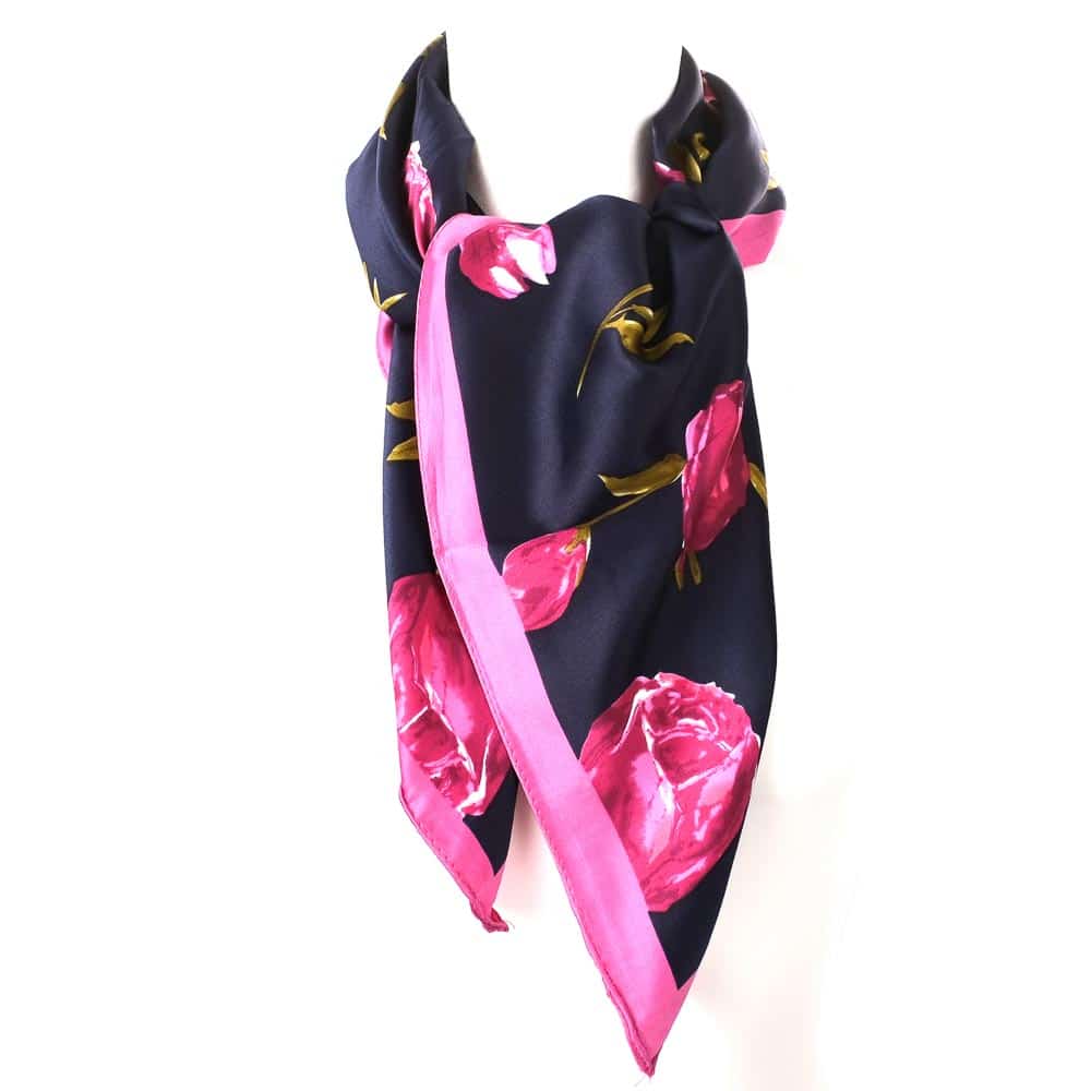 Elegáns vékony tavaszi kendő, sötétkék alapon mályva színű virágmintával.