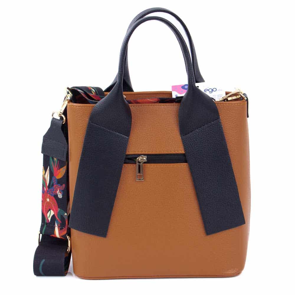 Álló formájú közepes méretű női bőr kézitáska fogantyúval, kézben hordható. A legjobb minőségű, természetes bőrből készült. A táska kialakítása egykamrás amely cippzárral záródik. A belseje strapabíró béléssel van ellátva, amelyben telefonzseb található. A táska hátoldalán cipzárral záródó kisebb zseb található. A levehető mintás, vastag, gurtni anyagú hosszú és széles pánt lehetővé teszi, hogy kényelmesen viselje akár a vállán is.