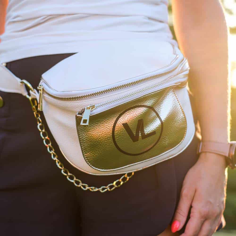 Ezzel a Vittoria Lucca övtáskával kitűnhetsz a tömegből! Különleges fehér-arany színösszeállítás és egy feltűnő, arany színű lánc teszi egyedivé. Az elején VL logó díszíti. Állítható hosszúságú pántjával vállon is hordható. A táska két részből áll, melyet arany színű cipzárral nyithatunk. A nagyobb rész belsejében egy újabb cipzáros zsebet találhatunk. A táskát díszítő arany színű lánc levehető.