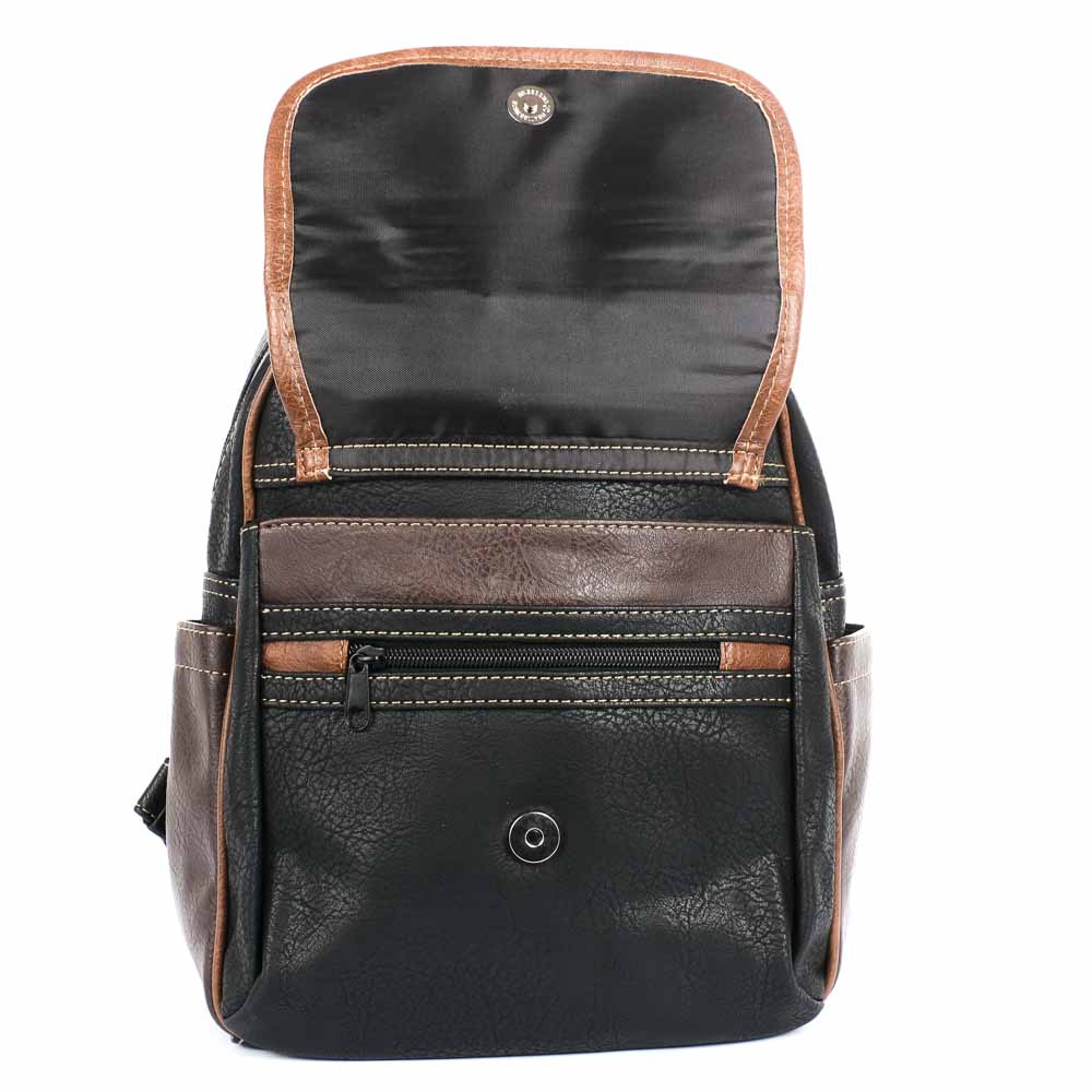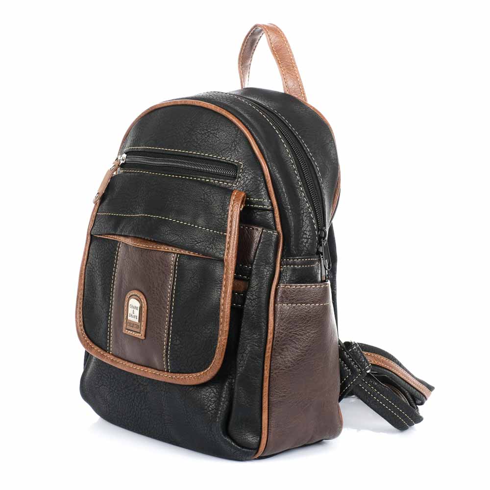 Klasszikus szabású, divatos hátizsák, hátitáska, fekete színben, barna betétekkel.