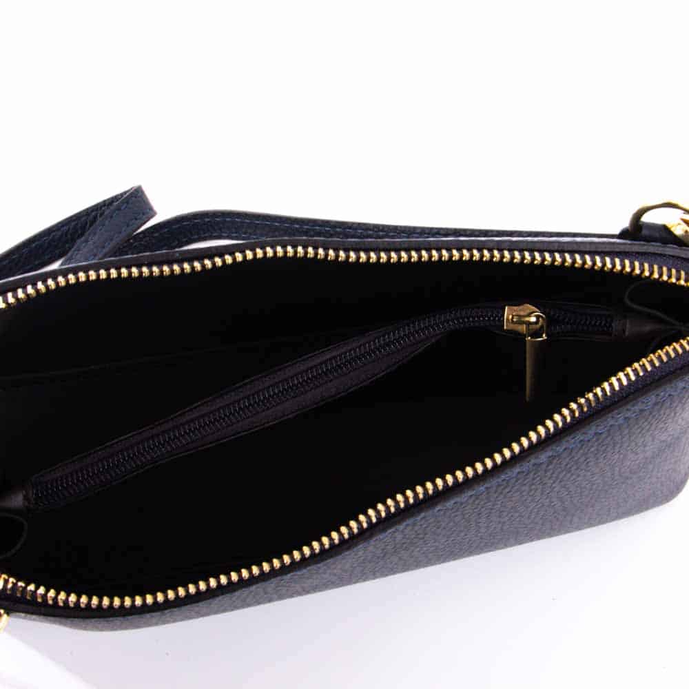 Ezt a kis táskát vállon lehet hordani. A legjobb minőségű, olasz, természetes marhabőrből készült, jellegzetes “szemcsés” állaggal. A táska kialakítása egykamrás. Belseje strapabíró béléssel, telefonzsebbel és cipzárral zárható rekesszel készült. Az egész dupla cipzárral záródik. A merevített alsó rész megakadályozza a táska deformálódását.