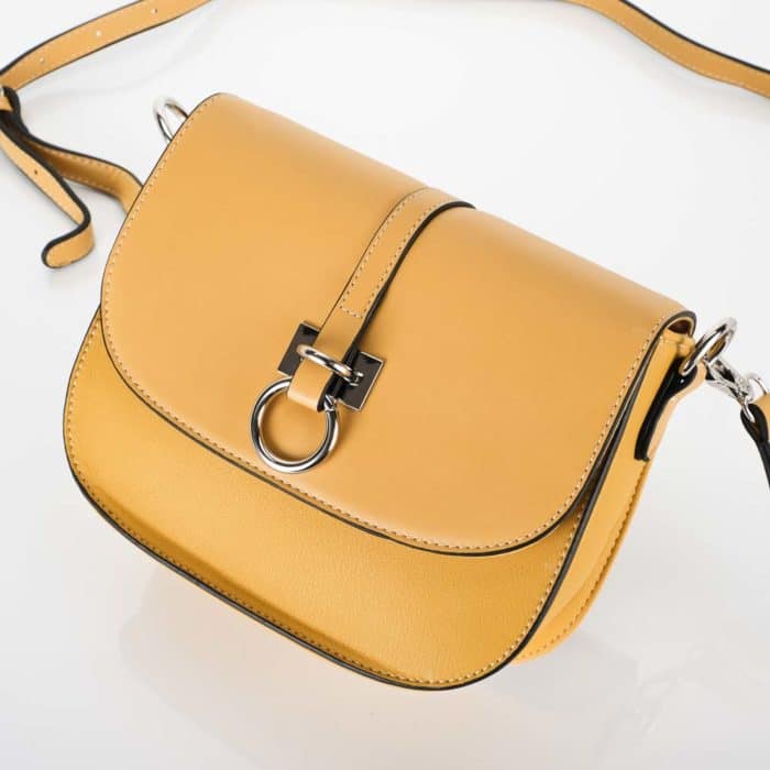 Praktikus és nőies, kis méretű válltáska élénk sárga színben! Mágneses patenttal nyitható felsőrész alatt cipzáros rész található.