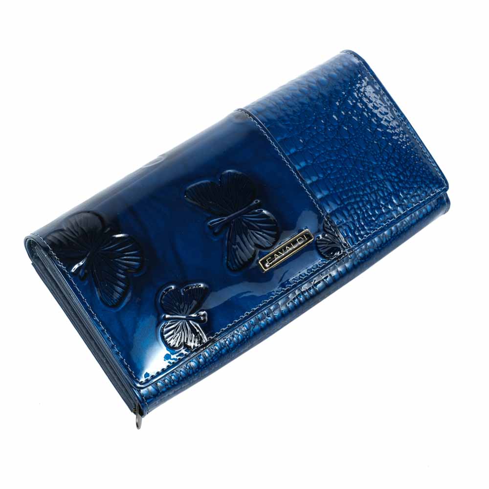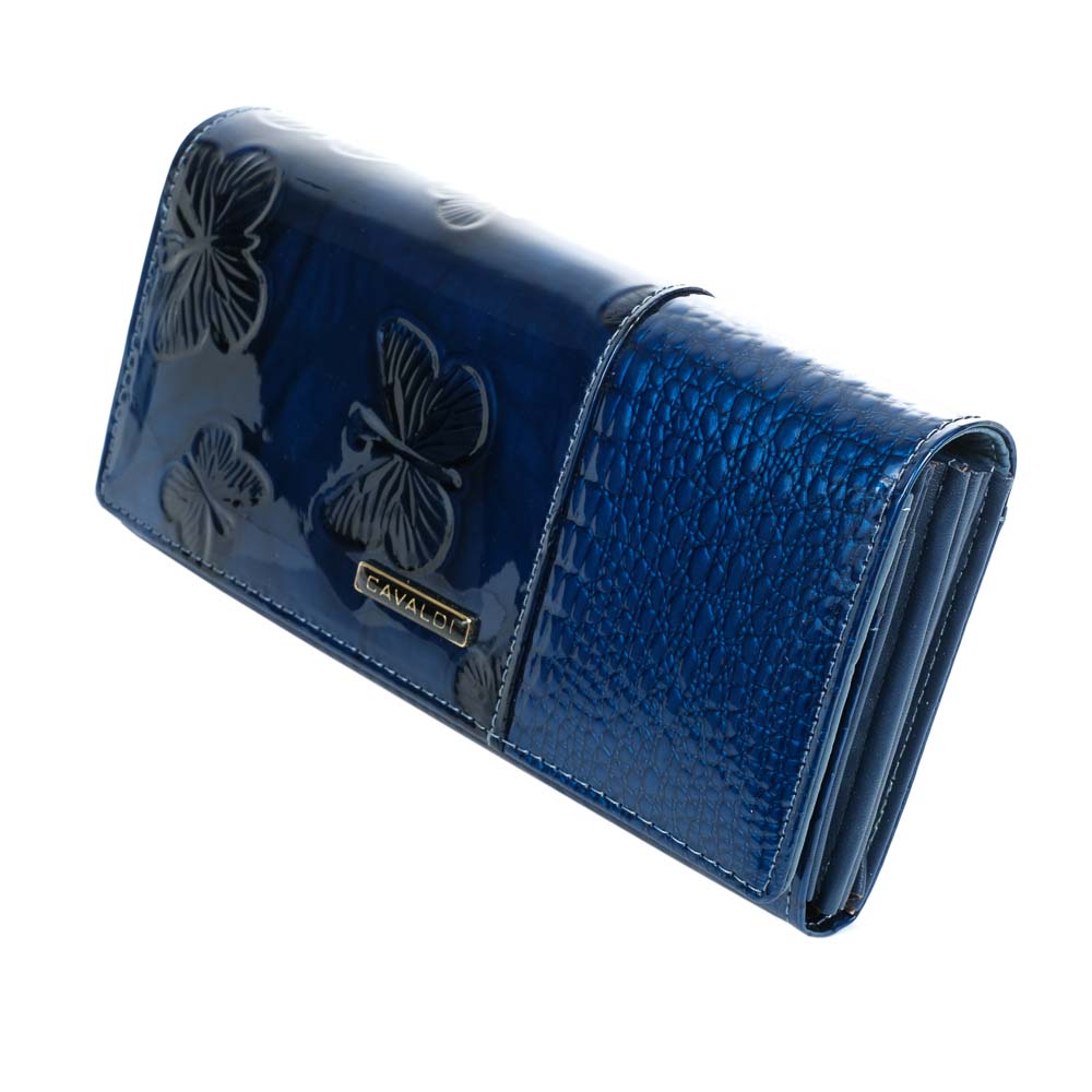 Valódi bőrből készült elegáns pénztárca, egész felületén lakkozott kék színben, pillangómintával. A pénztárca erős patenttal záródik a tárca alsó részén. 3 db papírpénztartóval és egy cipzárazható zsebbel, dupla aprópénztartóval, valamint 10 kártya és iratnak kialakított irattartó résszel rendelkezik. Díszdobozban szállítjuk, így ajándéknak, meglepetésnek is kiváló választás.