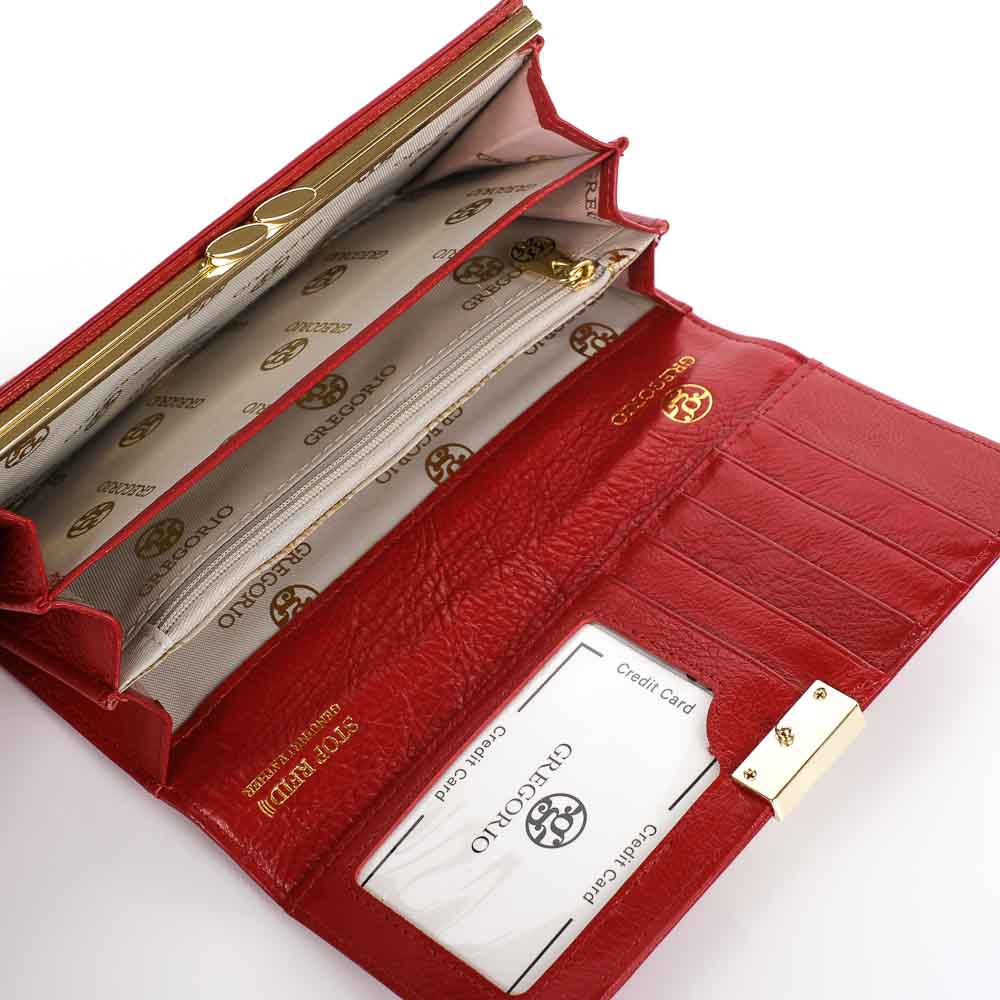 Különleges valódi bőr női pénztárca, matt bőr borítással. Elegáns piros színben, amely az alkalmi megjelenés egyik kiegészítőjeként is használható. Praktikus és divatos patenttal záródó kialakítás, 10 darab kártya és irat tárolására is alkalmas belsővel. 3 darabos papírpénz-tárolóval és egy cipzárral nyitható zsebbel, külön csattal nyitható dupla aprópénztartóval. Díszdobozban szállítjuk, így meglepetésnek vagy ajándéknak is tökéletes választás.