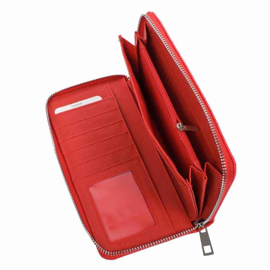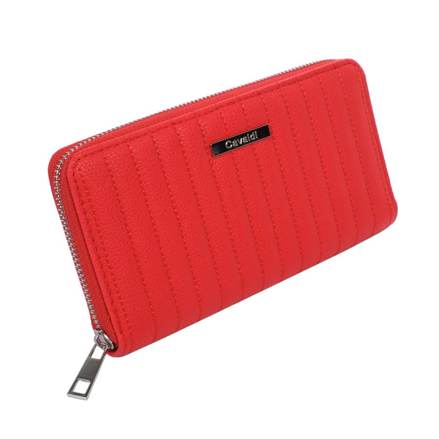 Nagyon szép piros árnyalatú Cavaldi pénztárca, elegáns külső borítással. Körbe cipzározható kialakítás. A tárcában 2 papírpénztartó, 1 cipzáros aprópénztartó, és 12 db kártyatartó található. A pénztárca anyaga poliészter.