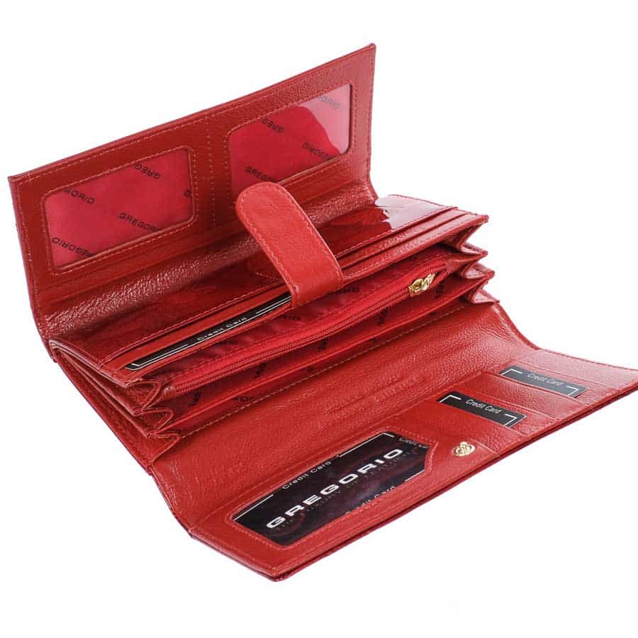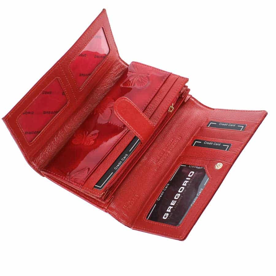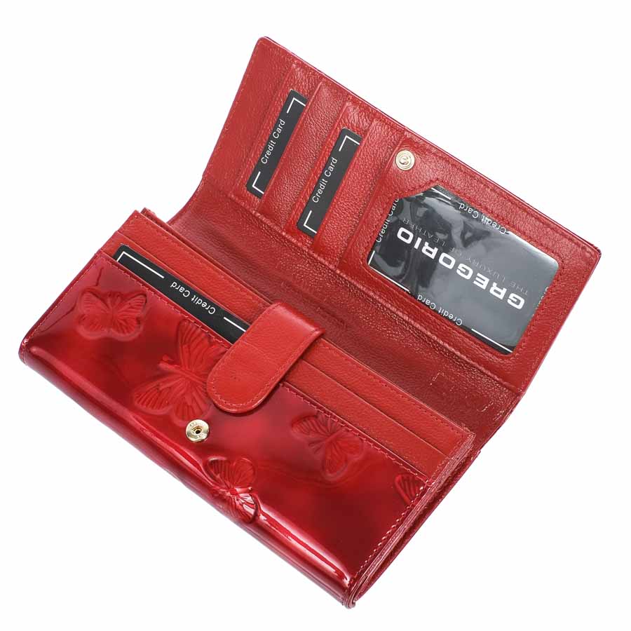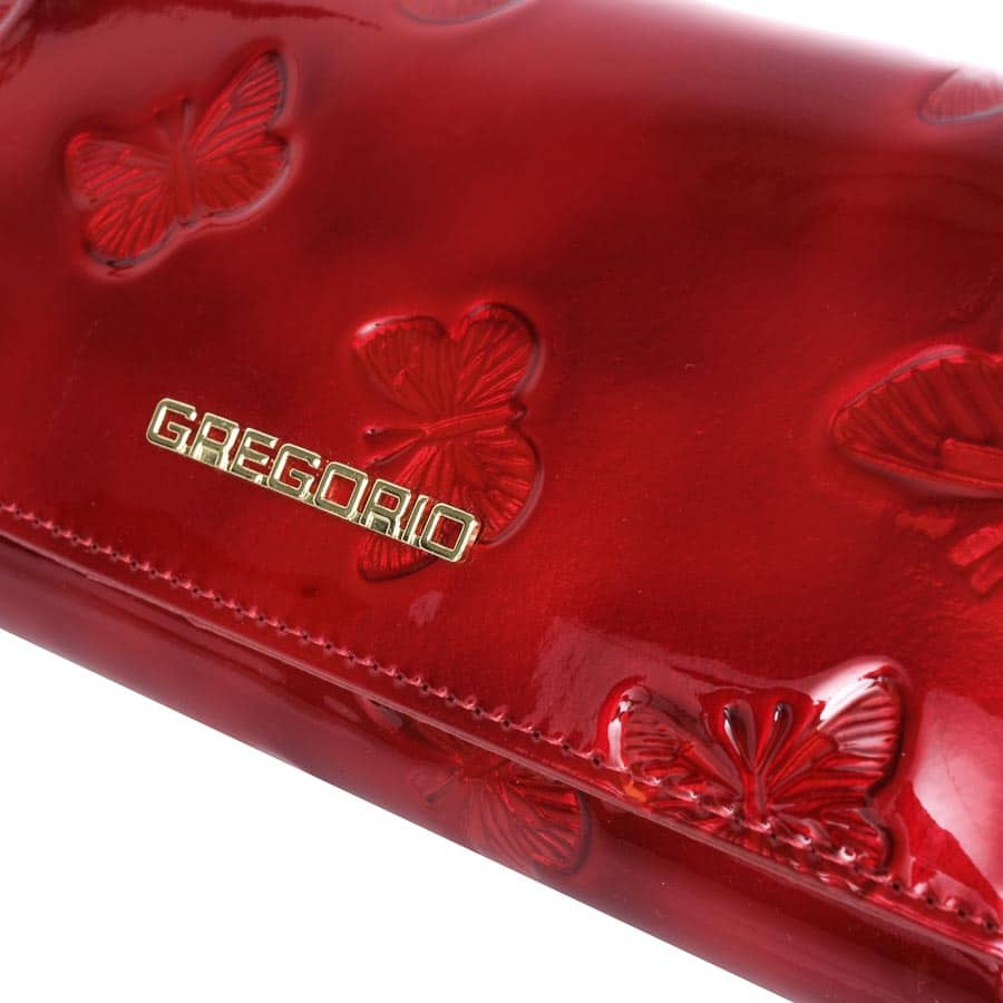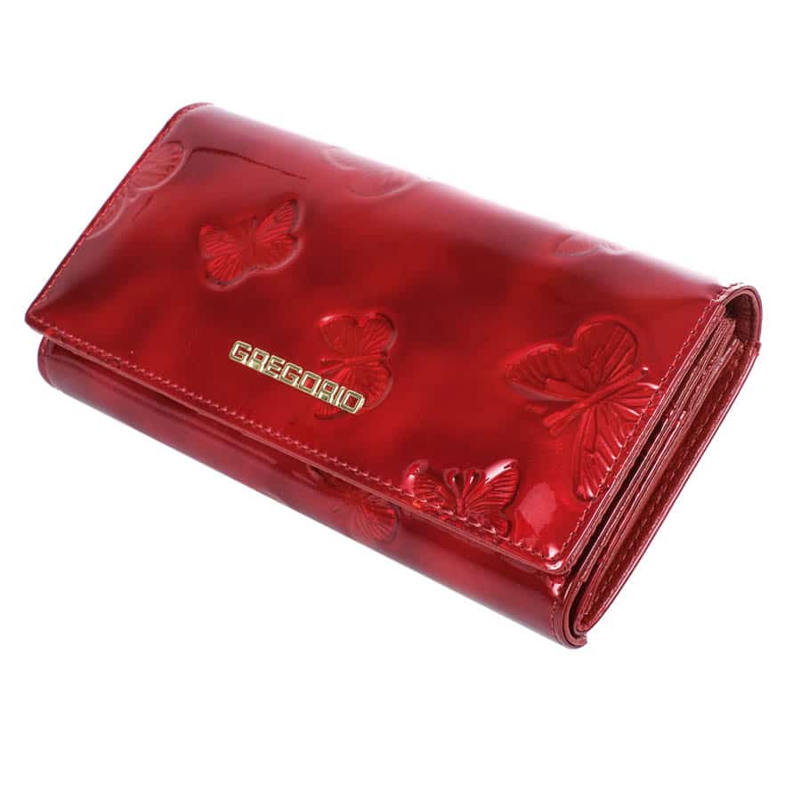 Valódi bőrből készült, Gregorio pénztárca díszdobozban. Erős patenttal zárható kialakítás, mely biztonságos és divatos! Teljes külső felületén lakkbőr, pillangó mintával.