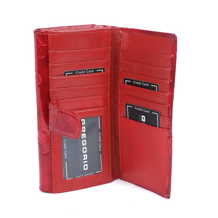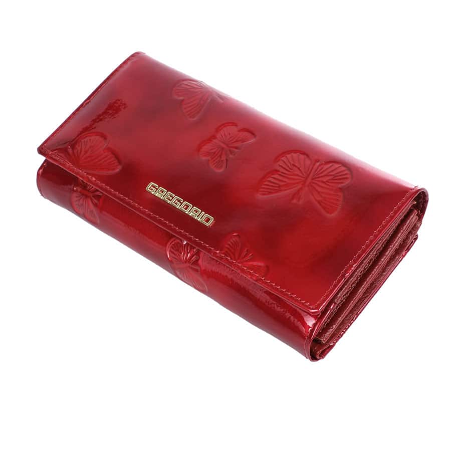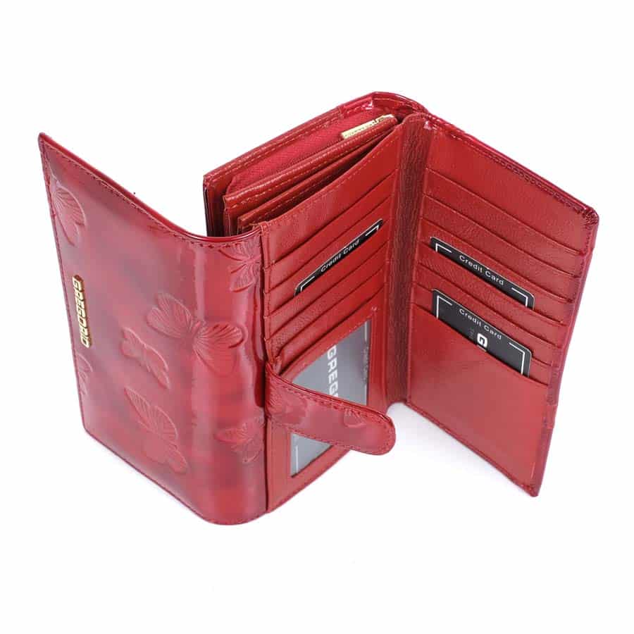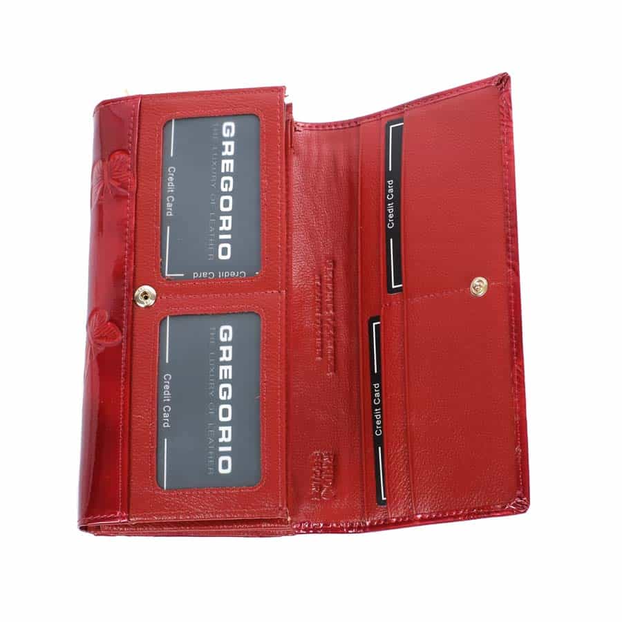 Prémium minőségű, valódi bőr Gregorio női pénztárca és irattartó. Teljes külső felülete fényes lakkbőr borítás, pillangómintával. Nagyon elegáns mélypiros színben. Két részből áll: hátul külön nyíló kártya és irattartó, elől a pénztárca rész. A pénztárca részben 8 darab hely van, a hátsó kártyatartóban 14 kártyának megfelelő kialakítás található. Összesen 22 darab kártya vagy irat tárolására alkalmas. Cipzárral zárható dupla aprópénz, és két papírpénz tartóval.