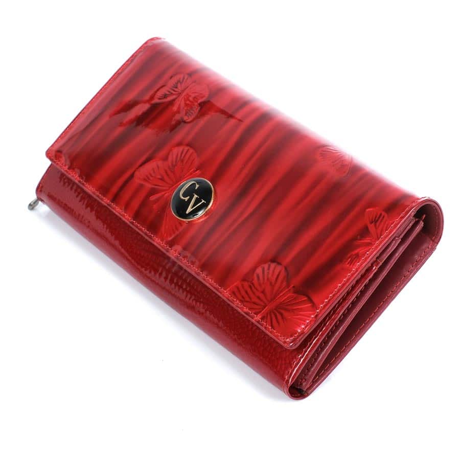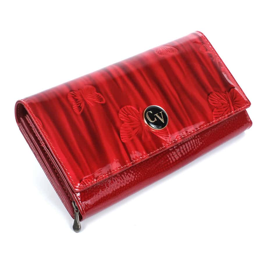 Teljes külső felületén lakkozott valódi bőrből készült Cavaldi női pénztárca pillangómintával, bordó színben, elején divatos Cavaldi logóval.
