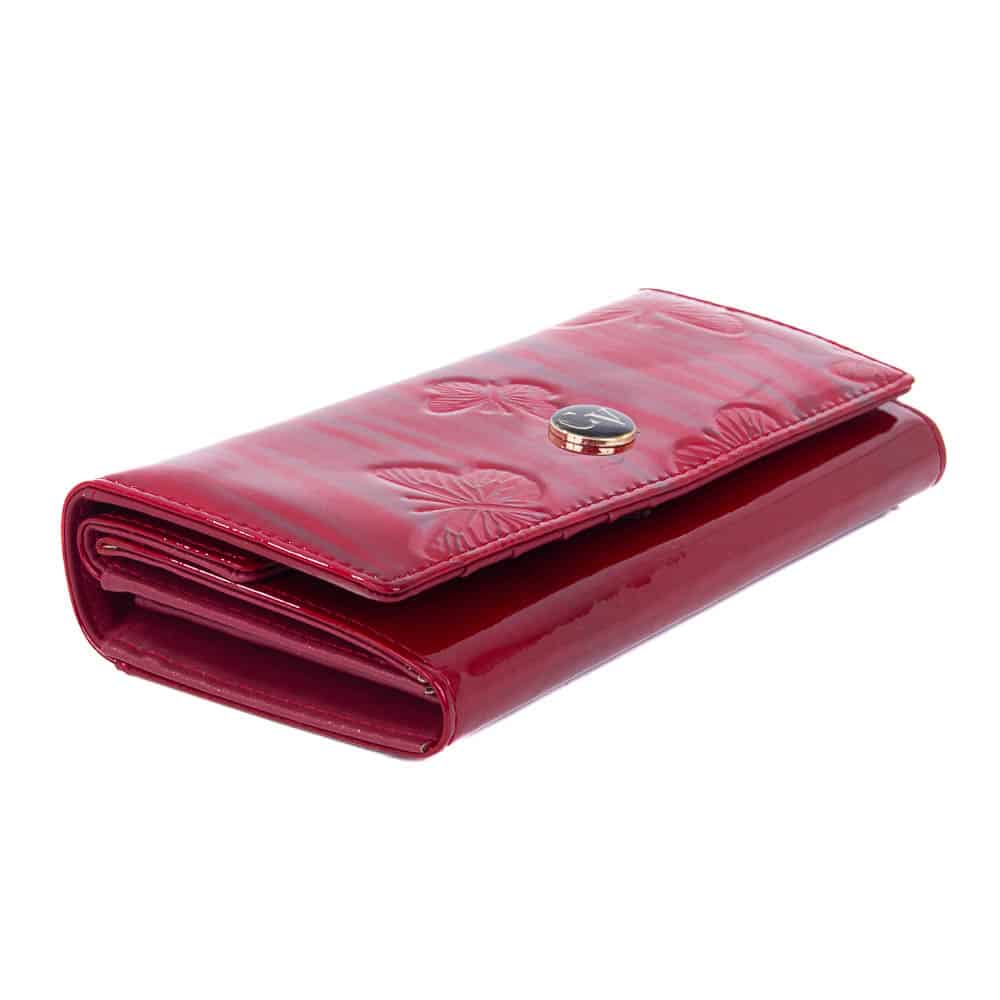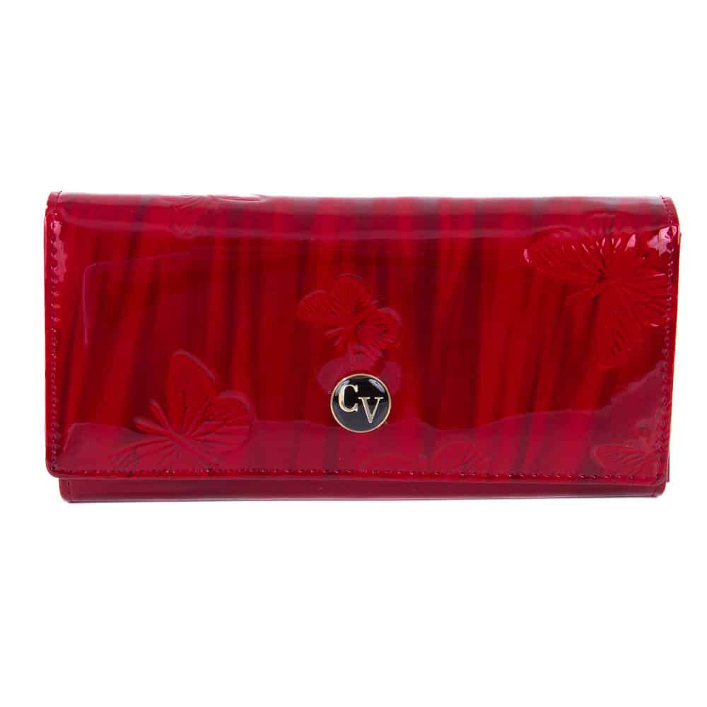 Teljes külső felületén lakkozott, valódi bőrből készült Cavaldi női pénztárca. Piros színben nyomott pillangó mintával. Divatos és letisztult, elején patenttal záródó kialakítással.