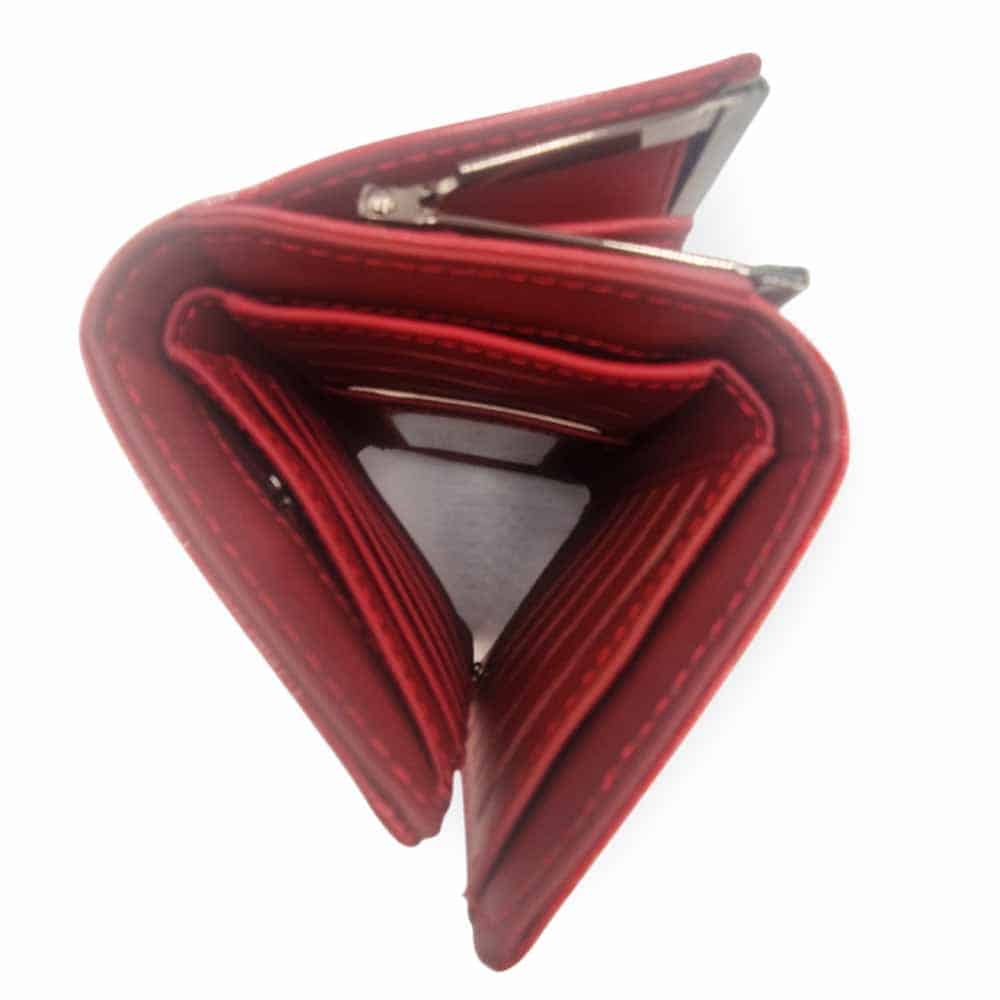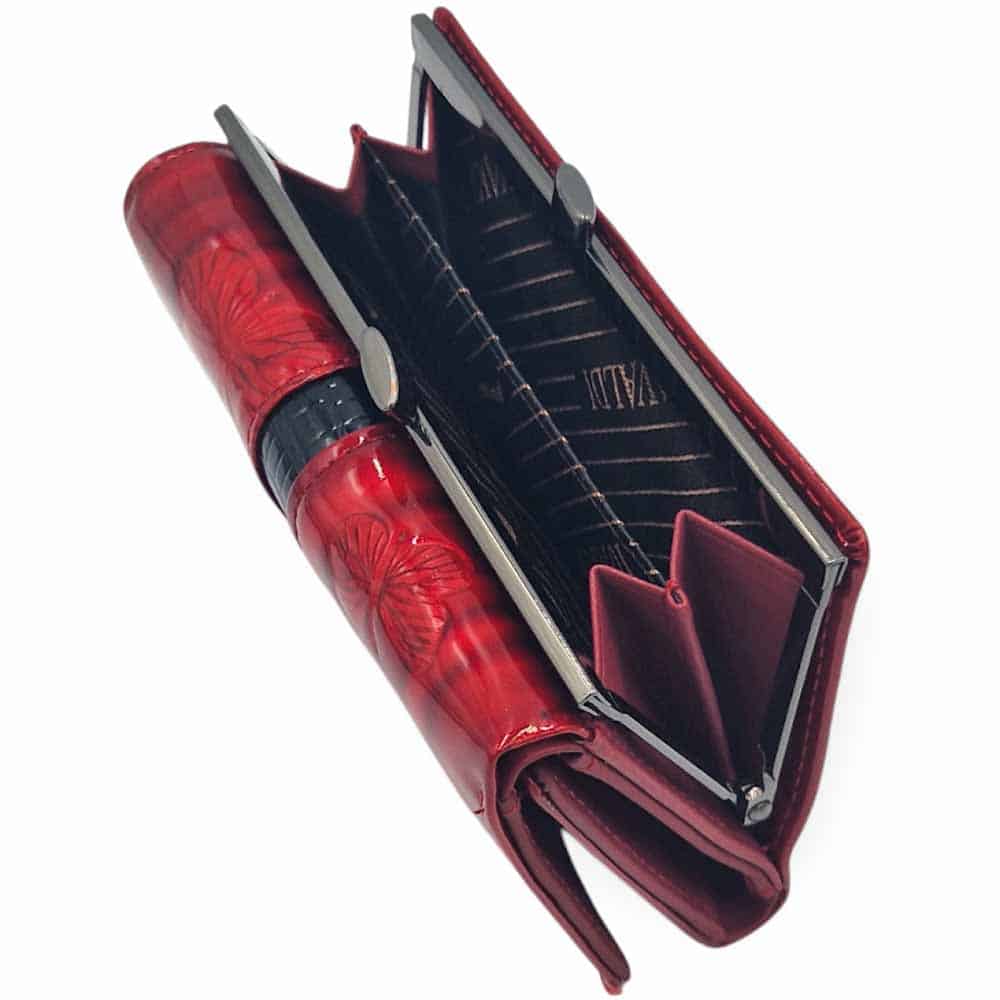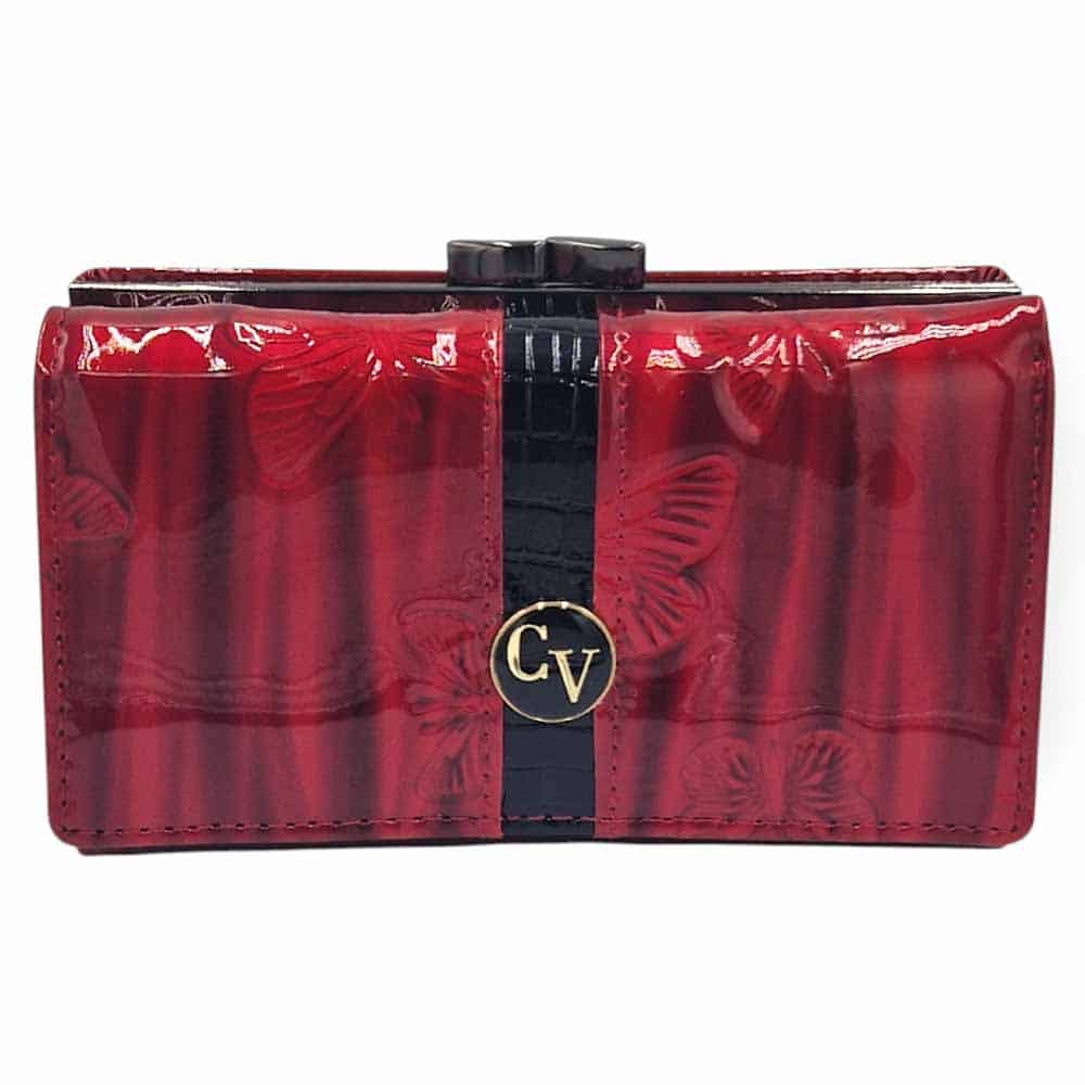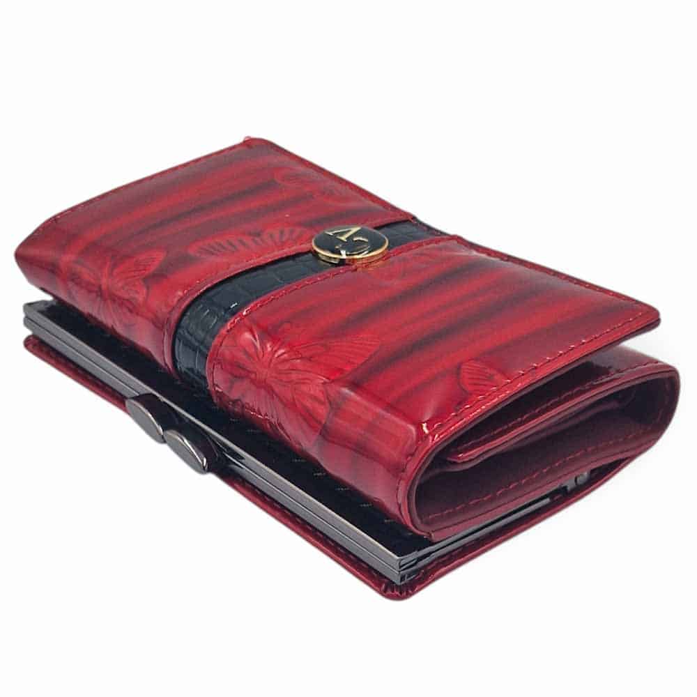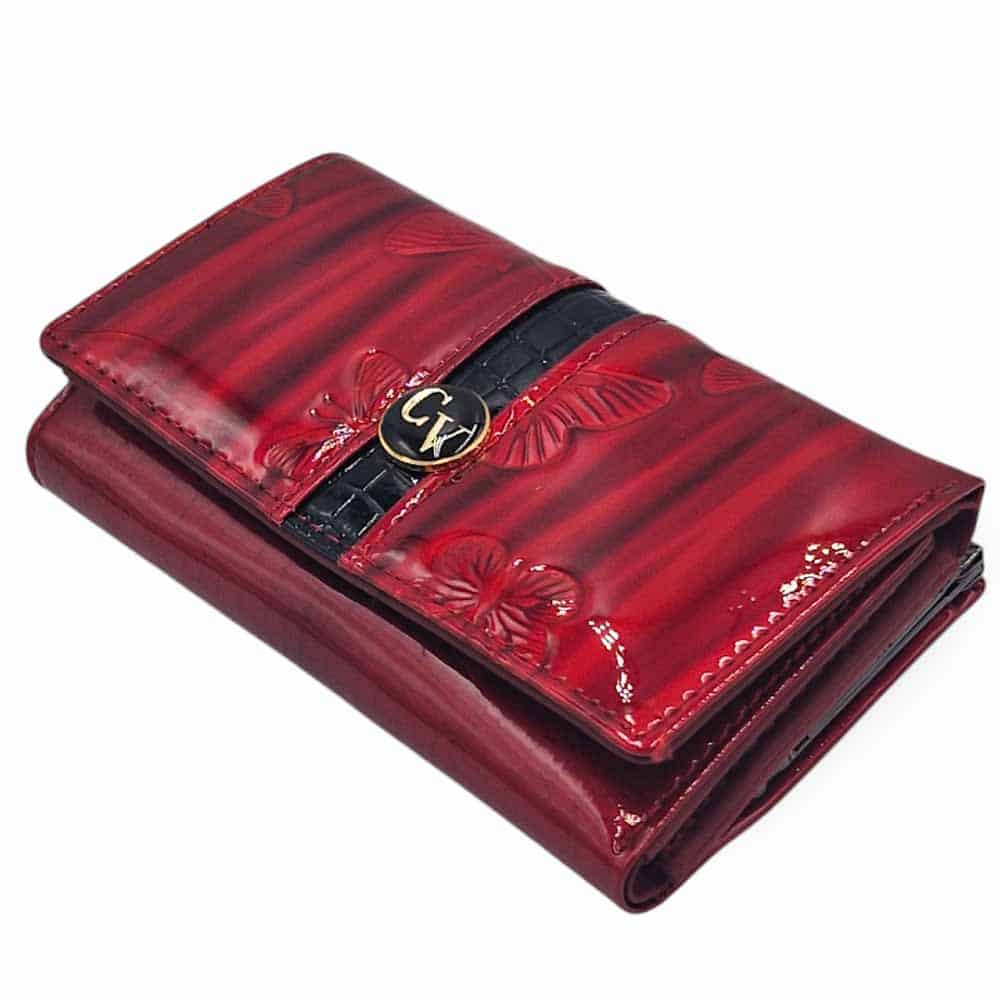 Teljes külső felületén lakkozott, valódi bőrből készült Cavaldi női pénztárca. Piros színben nyomott pillangó mintával. Divatos és letisztult, elején patenttal záródó kialakítással.