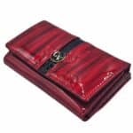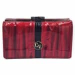 Teljes külső felületén lakkozott, valódi bőrből készült Cavaldi női pénztárca. Piros színben nyomott pillangó mintával. Divatos és letisztult, elején patenttal záródó kialakítással.