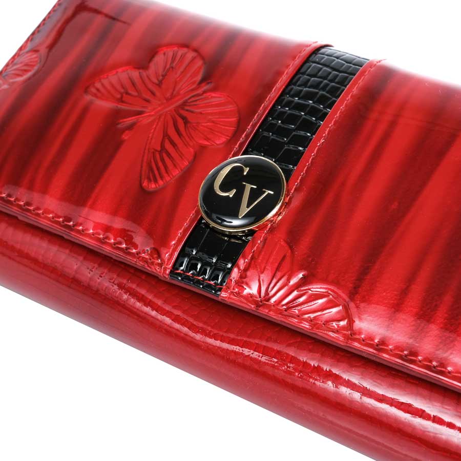 Teljes külső felületén lakkozott valódi bőrből készült Cavaldi női pénztárca pillangómintával, bordó színben, elején divatos fekete betéttel és Cavaldi logóval.