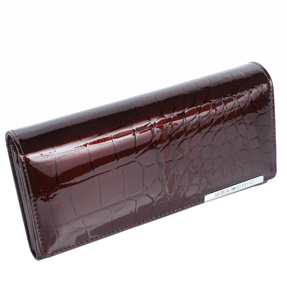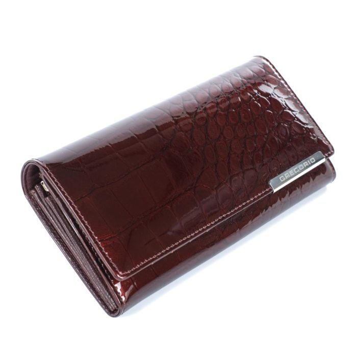 Igényes kivitelű, nagyon elegáns kialakítású valódi bőr Gregorio női pénztárca. Fényes, eleganciát sugárzó sötétbarna színben, különleges mintával, divatos lakkbőr borítással a teljes külső felületen. Egyszínű, barna belsőrésszel, ami tökéletesen passzol a küldő borításhoz. A pénztárca erős patenttal záródik a tárca alsó részén. 3 papírpénztartóval (+1 cipzáros zseb), aprópénztartója dupla, csattal zárható. Összesen 10 kártya és iratnak kialakított irattartó résszel. Díszdobozban szállítjuk, így ajándéknak vagy meglepetésnek is kiváló választás.