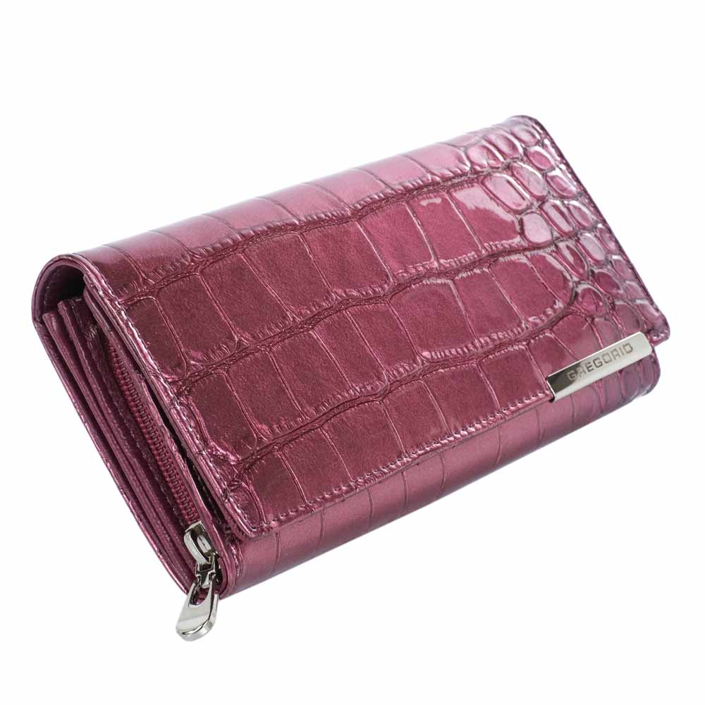 Igényes kivitelű, nagyon elegáns kialakítású valódi bőr Gregorio női pénztárca. Fényes, eleganciát sugárzó különleges lilás színben. Divatos lakkbőr borítással a teljes külső felületen, közkedvelt mintázattal. A külsőhöz illeszkedő egyszínű belső kialakítással. A pénztárca erős patenttal záródik a tárca alsó részén. Két papírpénztartóval és egy cipzárazható zsebbel rendelkezik, aprópénztartója dupla kialakítású és cipzárral zárható. 10 kártya és iratnak kialakított irattartó résszel. Díszdobozban szállítjuk, így ideális ajándéknak, meglepetésnek hölgy ismerősnek.