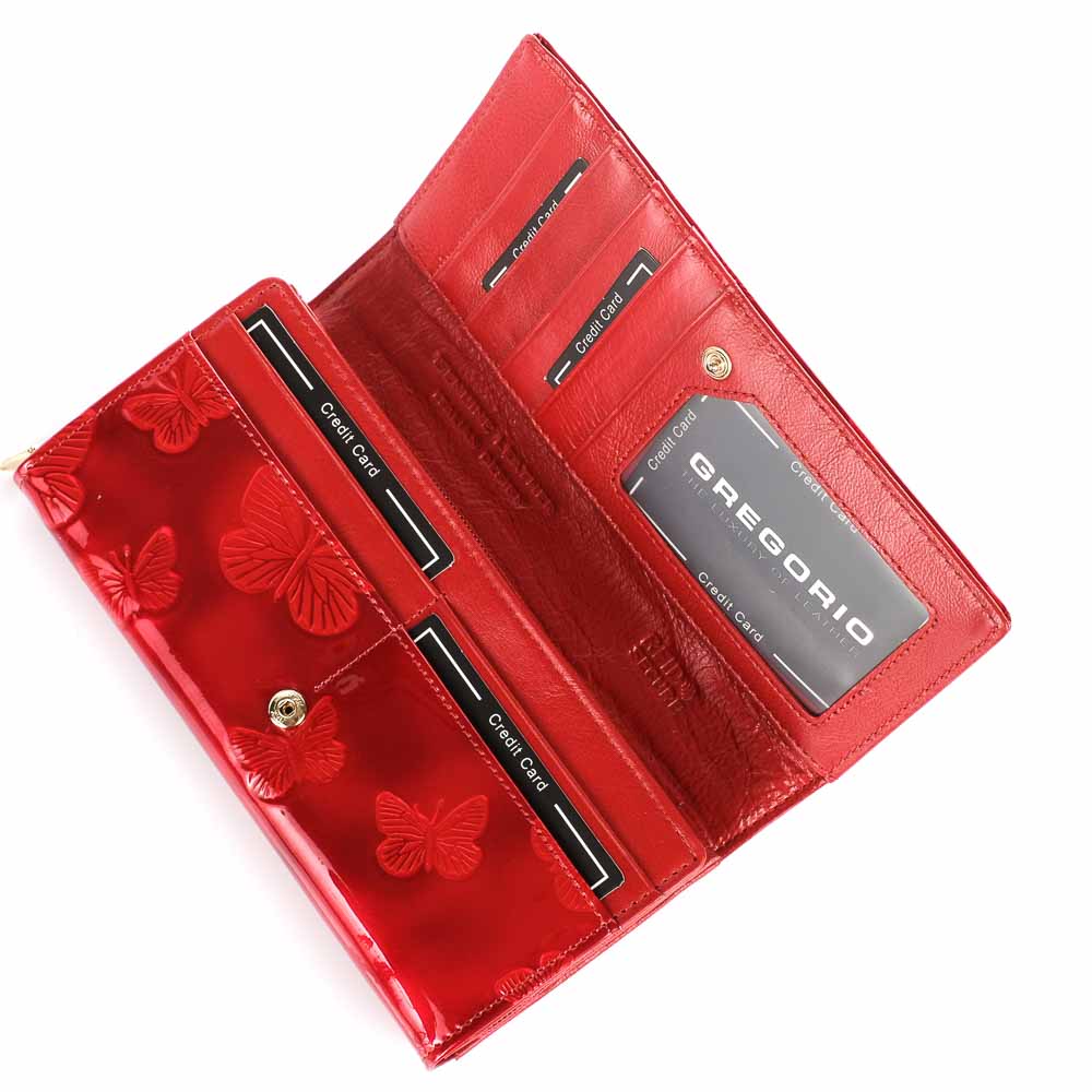Elegáns kialakítású valódi bőr Gregorio női pénztárca RFID blokkolóval. Nagyon elegáns és divatos lakkbőr borítással a teljes külső felületen pillangó mintázattal, piros egyszínű belsőrésszel. A pénztárca erős patenttal záródik a tárca alsó részén. Két papírpénztartóval és egy cipzárazható zsebbel, aprópénztartója dupla kialakítású és cipzárral zárható. 10 kártya és iratnak kialakított irattartó résszel. Díszdobozos csomagolással.