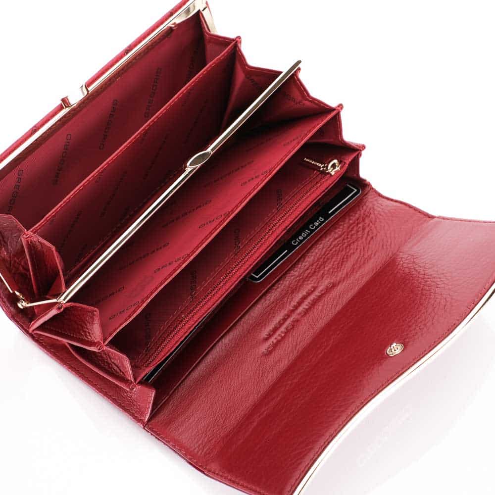 Kifejezetten elegáns, piros színárnyalatú Gregorio női pénztárca valódi bőrből. Fényes teljes felületén lakkozott borítással.