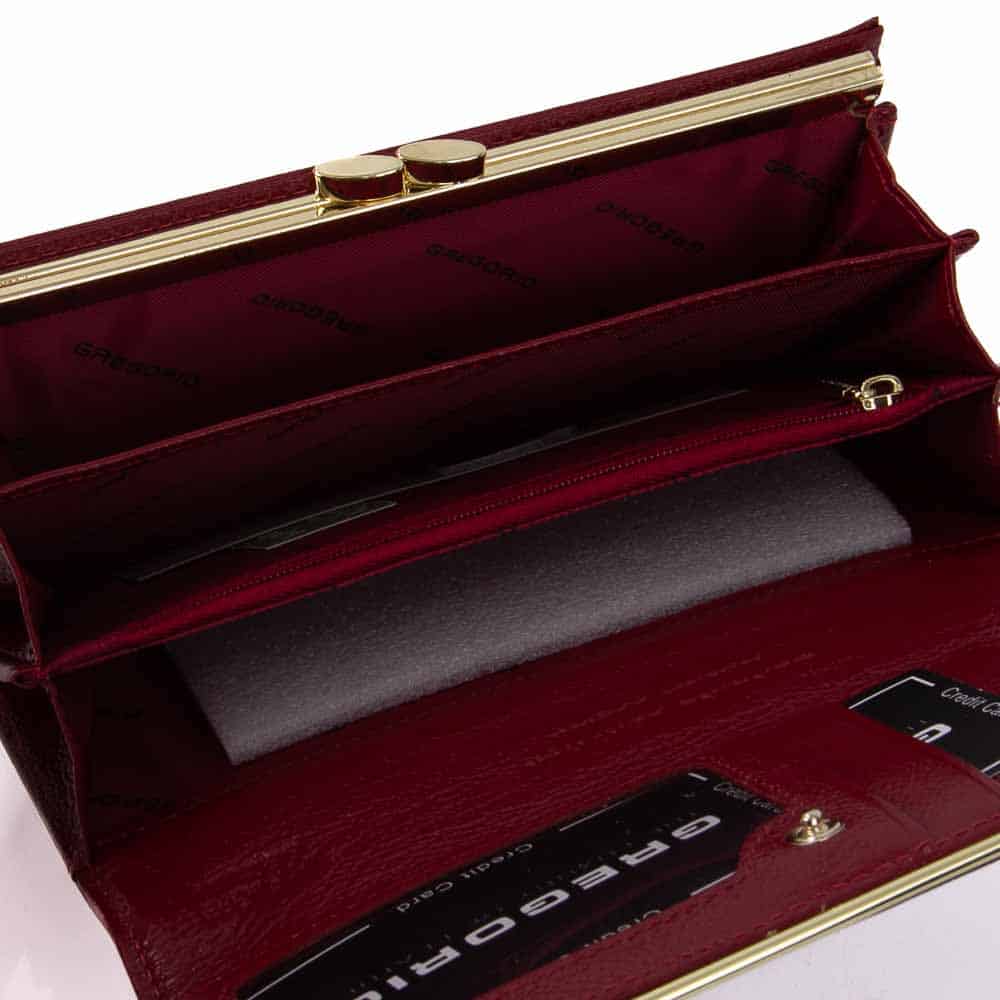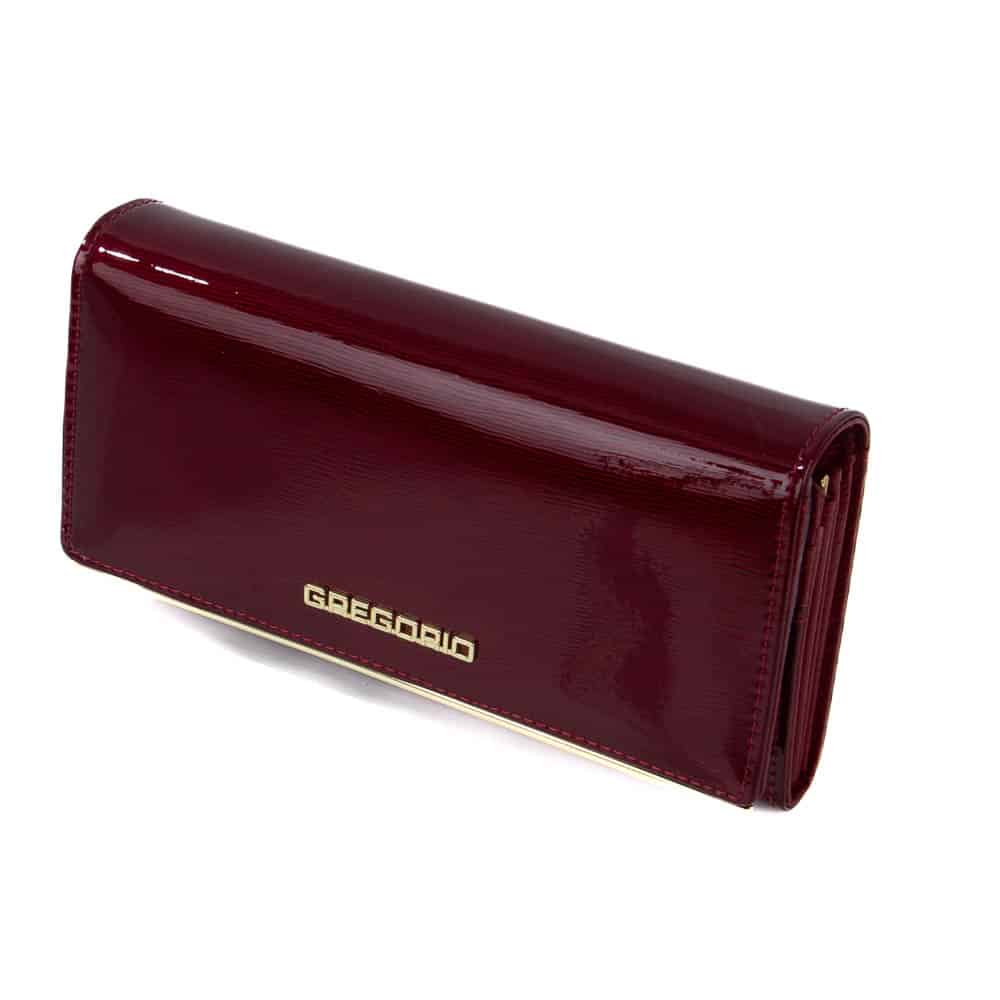 Kifejezetten elegáns, bordó színű Gregorio női pénztárca valódi bőrből. Fényes, teljes felületén lakkozott borítással, arany színű fém csíkkal az elején.