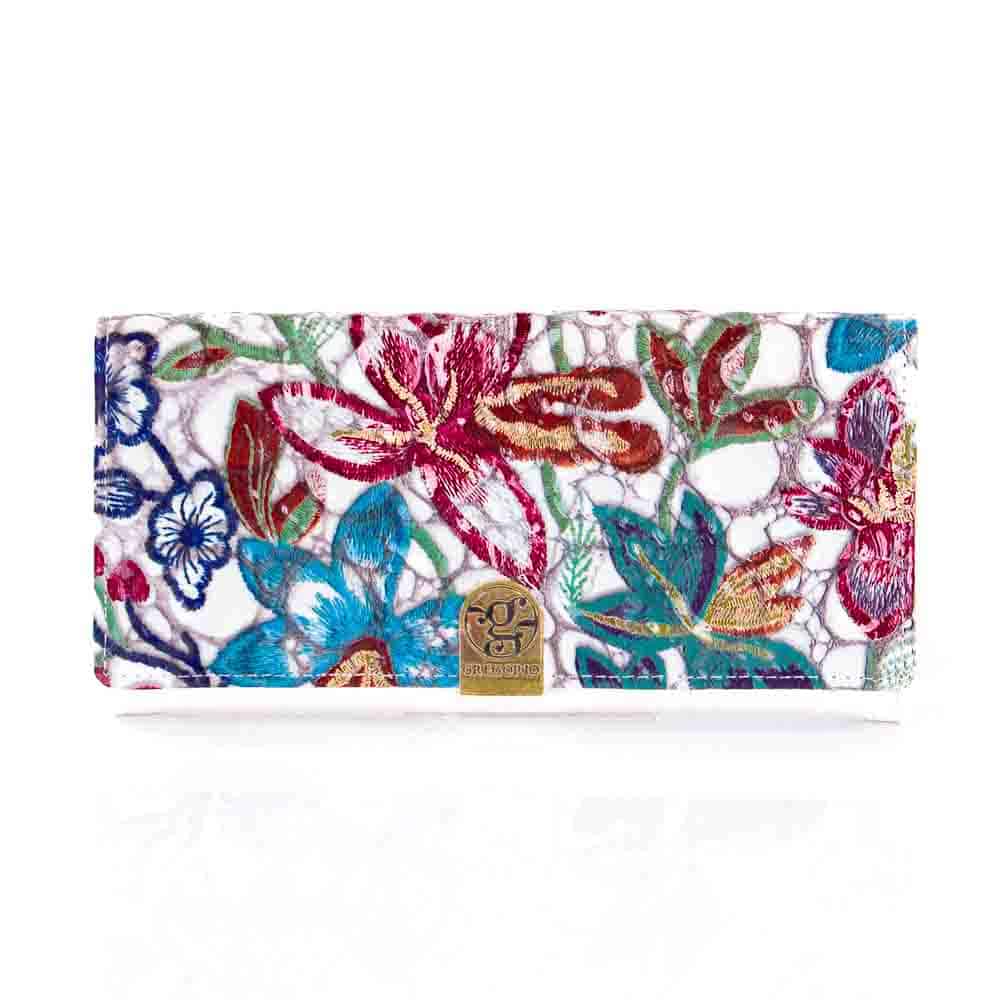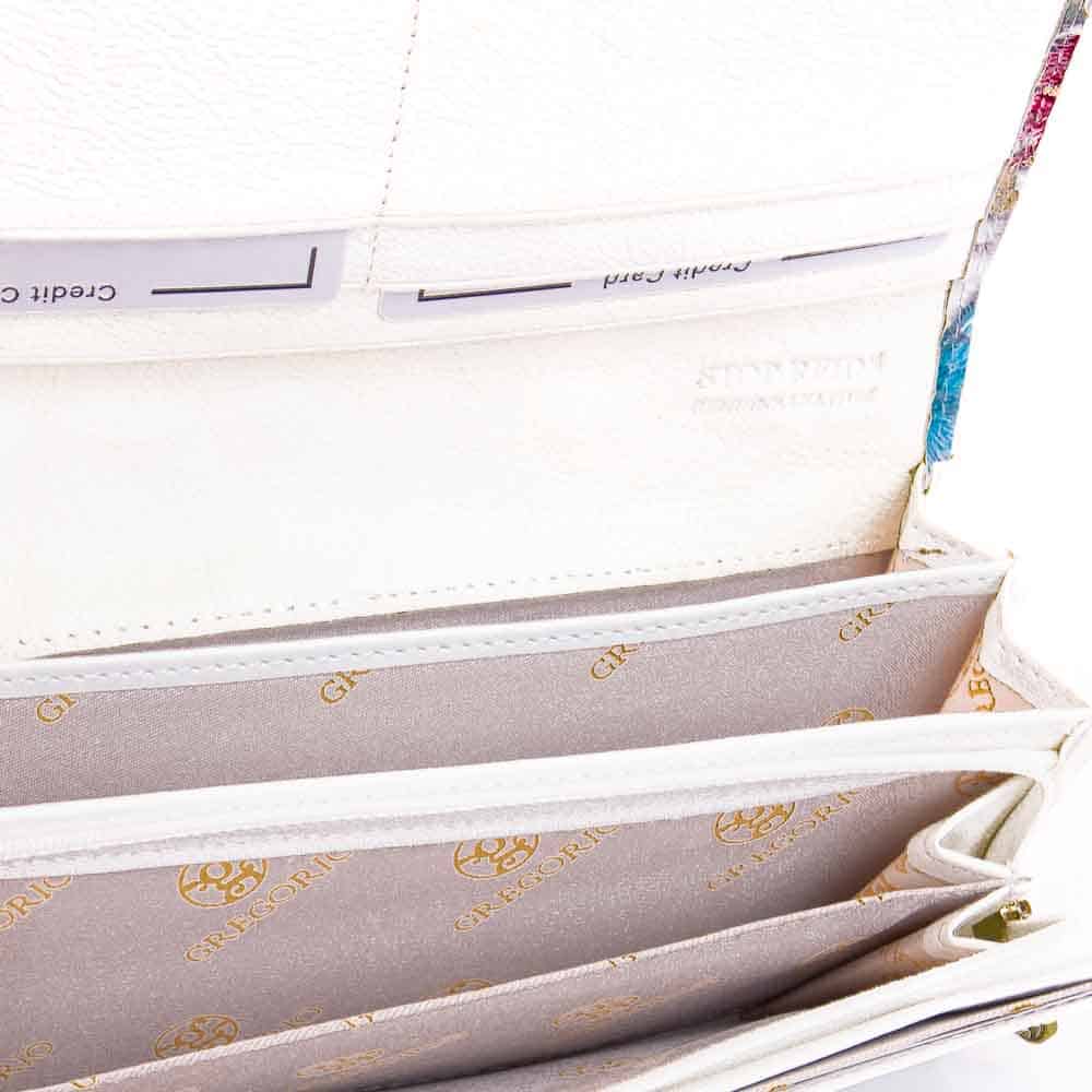 Első részén valódi lakkbőrből készültGregorio női pénztárca színes virágmintával, divatos Gregorio logóval, belső felületén egyszínű fehér bőrborítással.