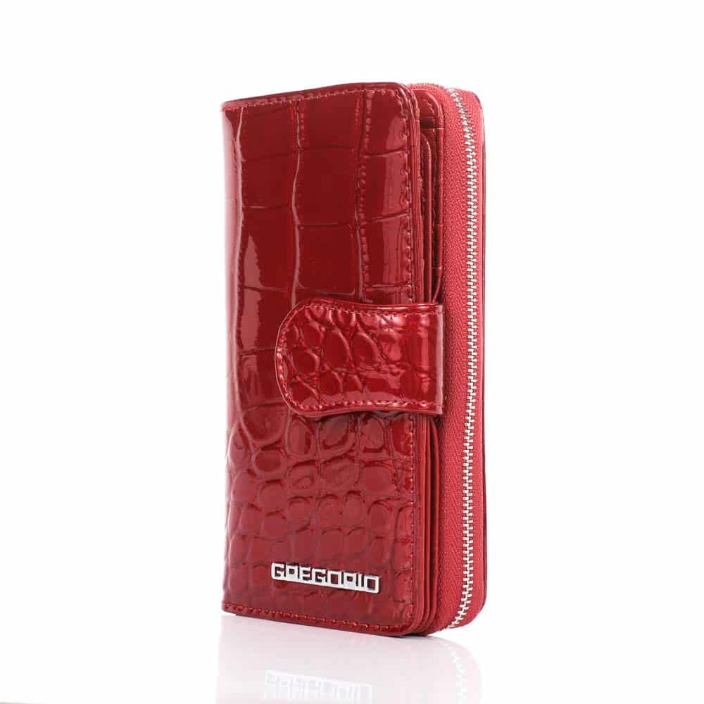 Teljes külső felületén karcálló lakkbőr pénztárca. Márkája: Gregorio. Valódi bőrből készült, egyedi színekben. Divatos és letisztult, elején patenttal záródó kialakítással.