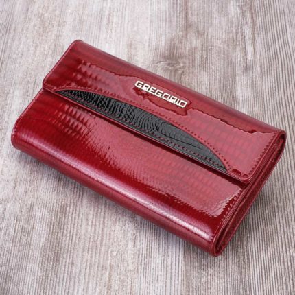 Teljes külső felületén lakkbőr Gregorio pénztárca. Valódi bőrből készült, egyedi színekben. Divatos és letisztult, elején patenttal záródó kialakítással.