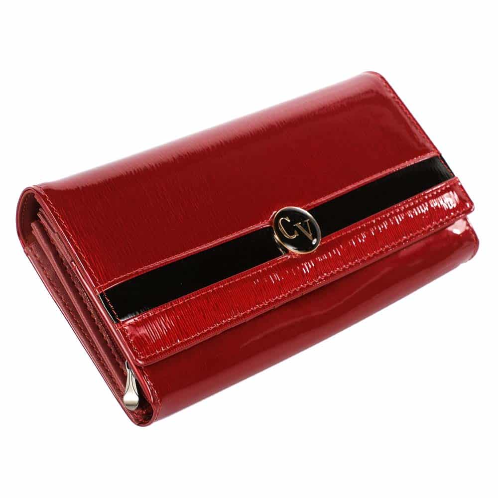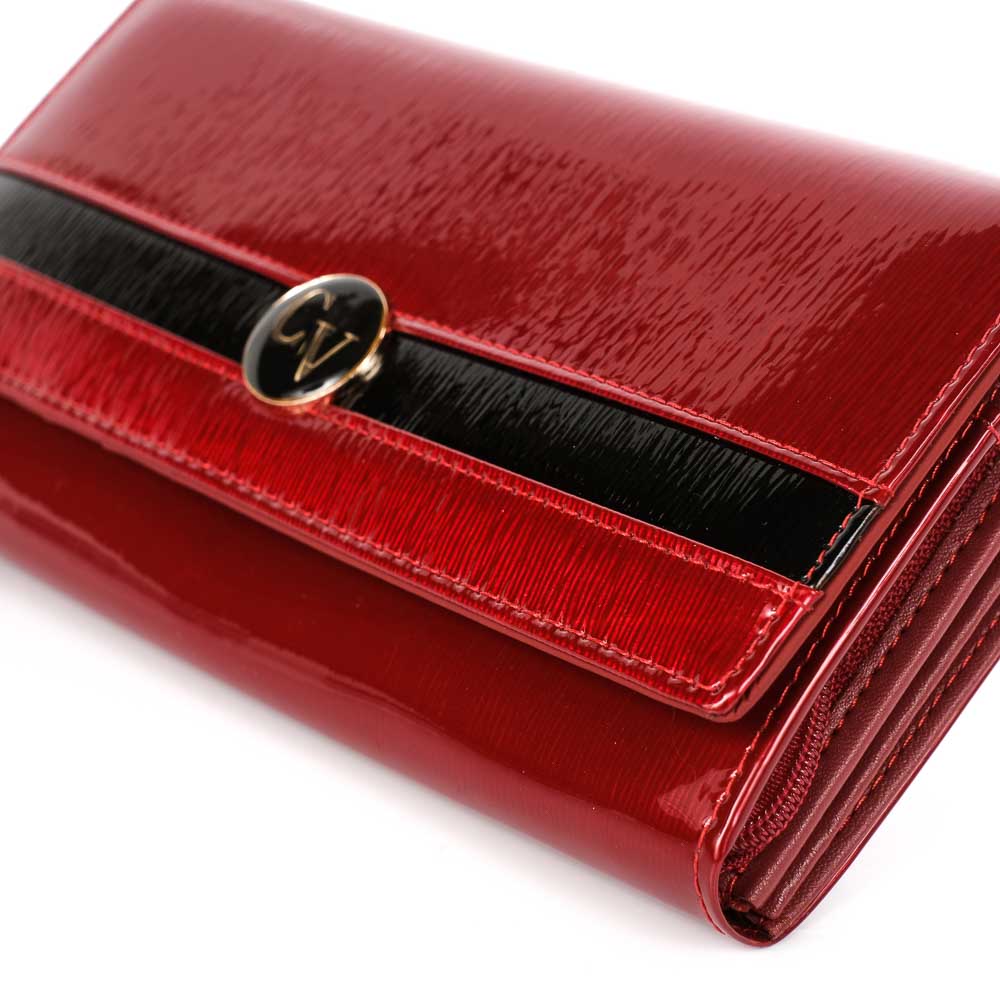 Meggypiros színű, valódi bőrből készült Cavaldi női pénztárca. Divatos és letisztult, elején patenttal záródó kialakítással. Teljes külső felülete fényes lakkozott kivitelű, első részén fekete csíkkal és Cavaldi logóval díszítve. Kiválóan alkalmas hétköznapi, vagy elegáns szettjéhez is.