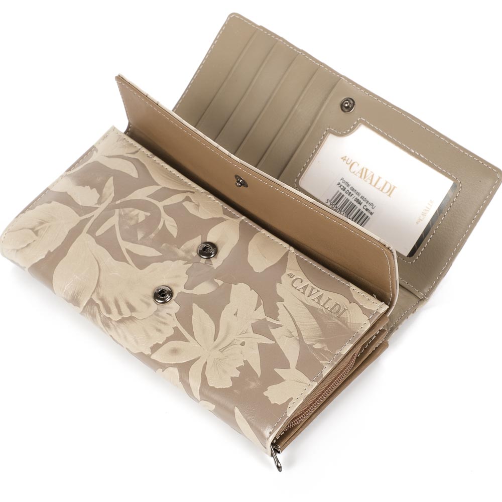 Egyedi, valódi bőr Cavaldi női pénztárca visszafogott drapp-barna színárnyalatban, falevél mintázattal. Erős patenttal zárható kialakítás, amely divatos és elegáns. Dupla papírpénztartóval, cipzáros aprópénztartóval. 6 darab kártya és irat tárolására alkalmas résszel, plusz egy patentos és egy cipzáros zsebbel. Díszdobozos csomagolással kapható, így ajándéknak is ideális választás!