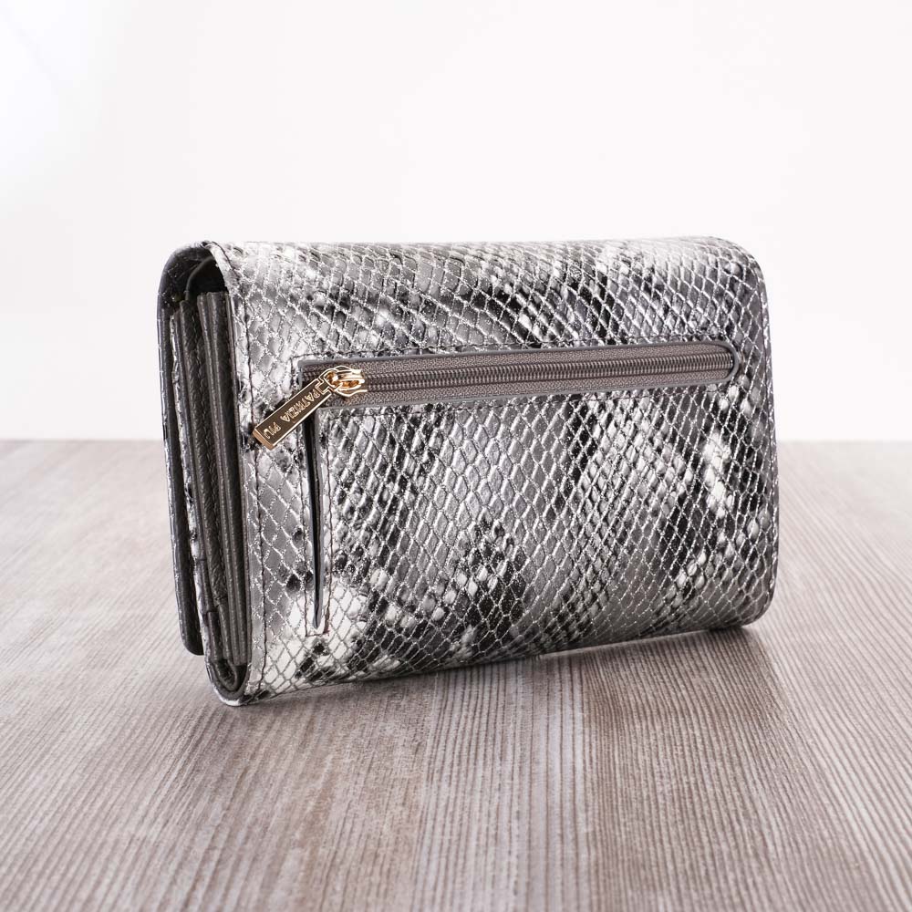 Valódi bőrből készült Patrizia pénztárca díszdobozban. Erős patenttal zárható kialakítás, mely biztonságos és divatos! Teljes külső felületén különleges ezüst minta.