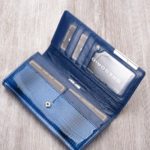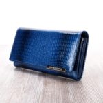 Különleges és egyedi mintázatú valódi bőr női pénztárca, lakkbőr borítással. Elegáns királykék színben, amely az alkalmi megjelenés egyik kiegészítőjeként is használható. Praktikus és divatos patenttal záródó kialakítás, 10 darab kártya és irat tárolására is alkalmas belsővel. 3 darabos papírpénz tárolóval és egy cipzárral záródó zsebbel, aprópénztartóval. Díszdobozzal kapható, így meglepetésnek vagy ajándéknak is tökéletes választás.