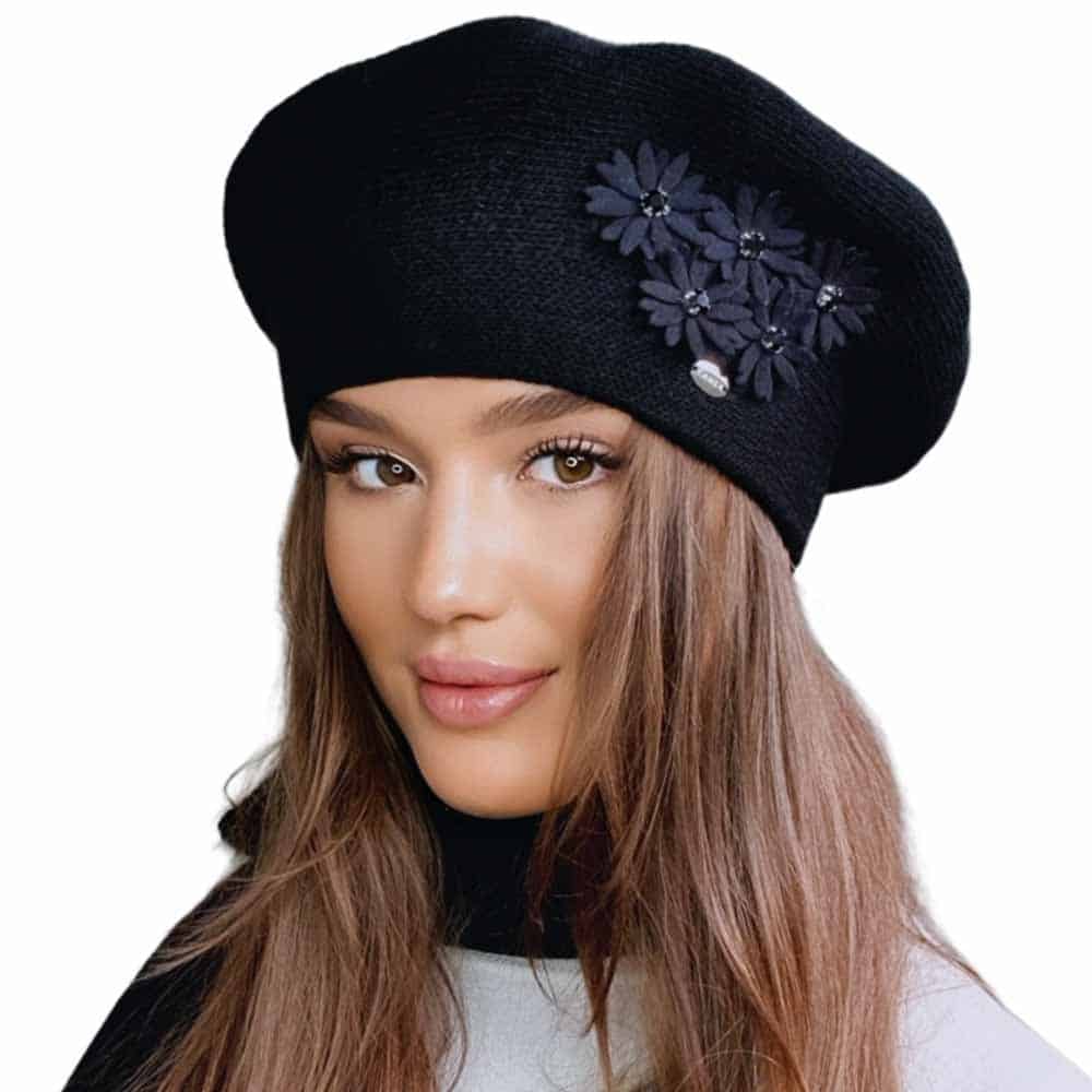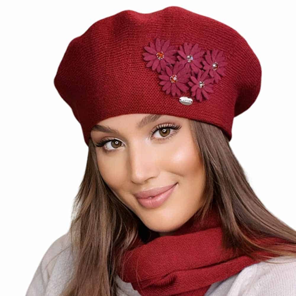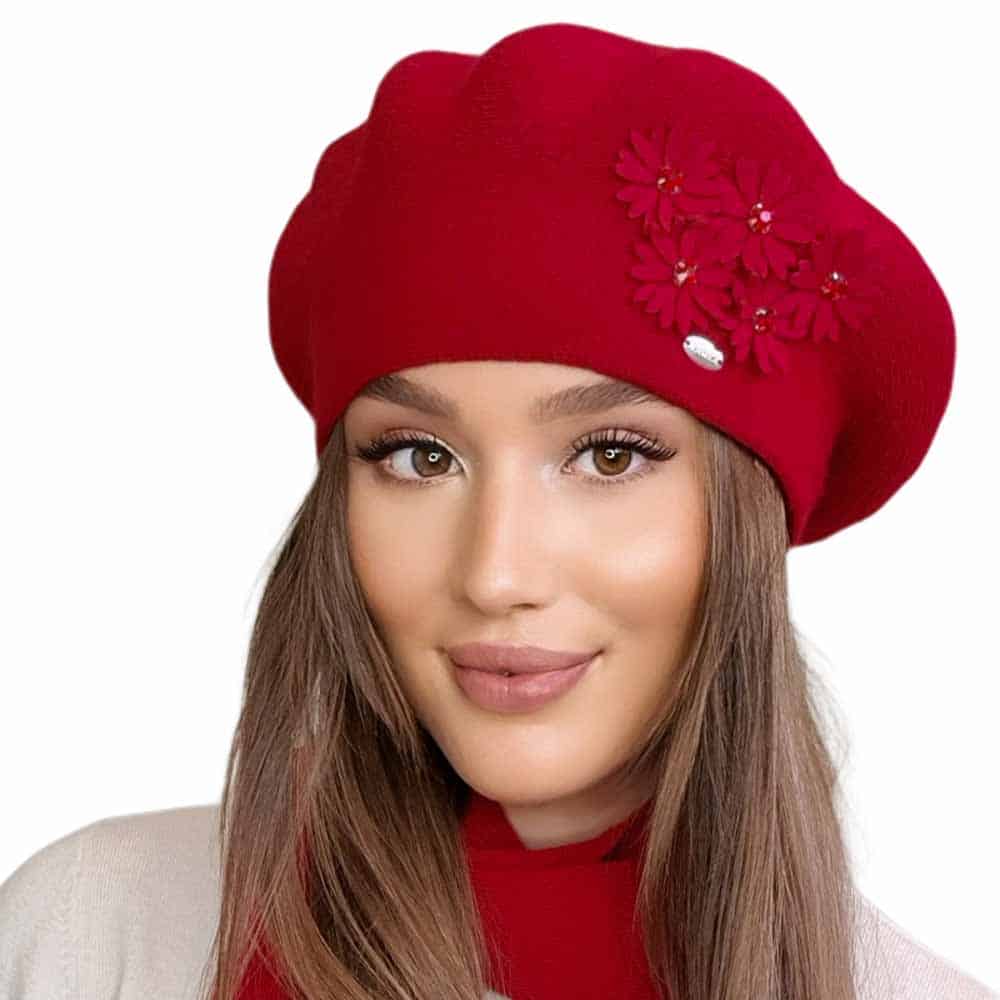 Kamea Tala, Lengyelországban készült, 30% gyapjútartalommal rendelkező, kiváló minőségű női beret sapka. Virágokkal és strasszkővel díszítve.