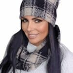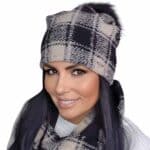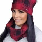 Kamea Gambit, Lengyelországban készült, 50% gyapjútartalommal rendelkező, kiváló minőségű puha szövésű piros fekete kockás női téli sapka ponponnal díszítve és a hozzá való azonos anyagból készült körsál.